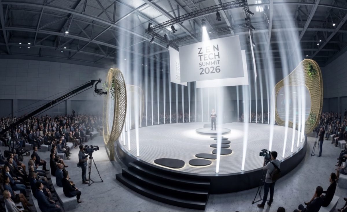 The concept is an IT conference inspired by Zen—a philosophy and practice rooted in Buddhism. Look closely and you’ll notice that the stage resembles a dry landscape garden.