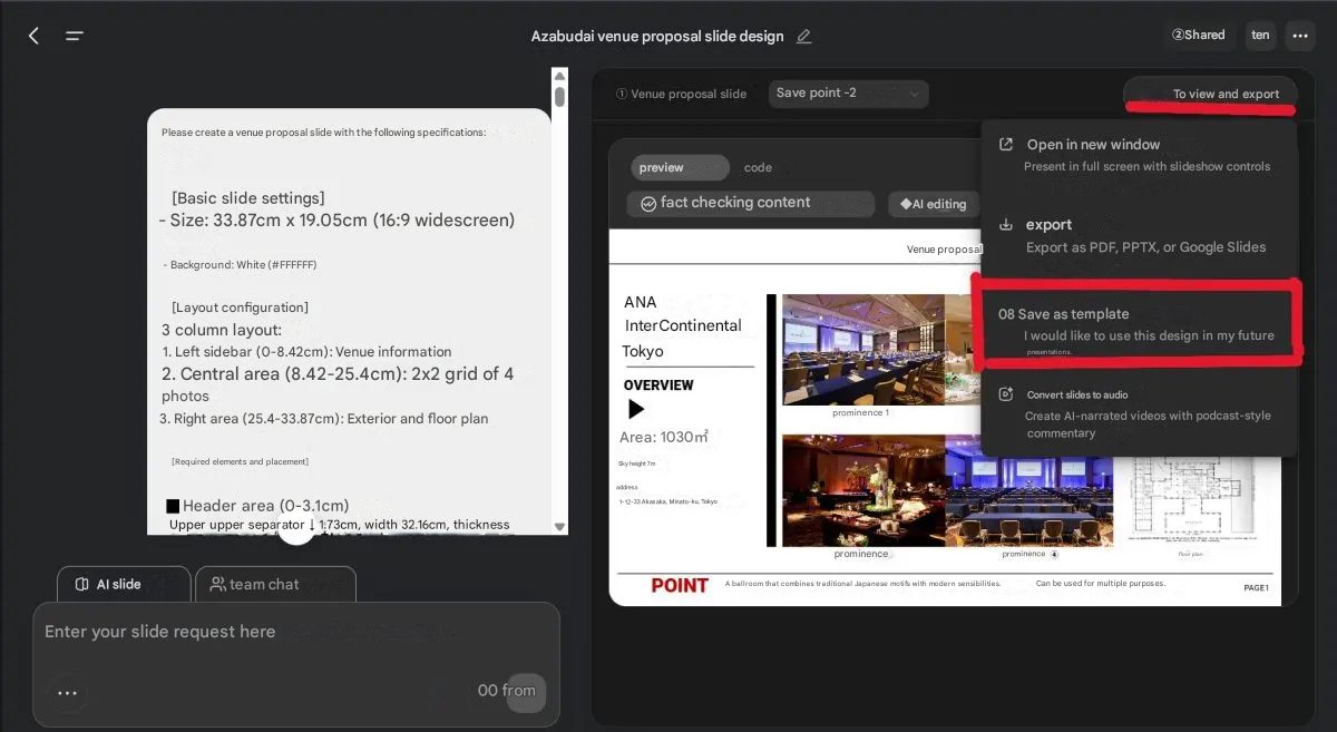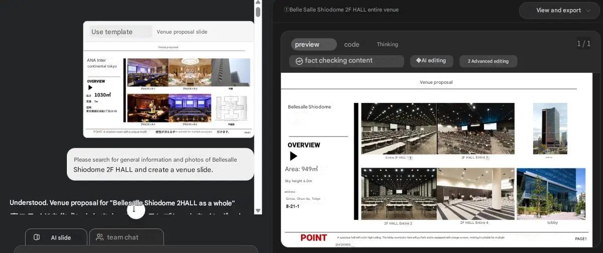 By executing this prompt, Genspark automatically searches for information and creates venue introduction slides (layout, basic information, photos, access, etc.) that adhere to the format of the template.