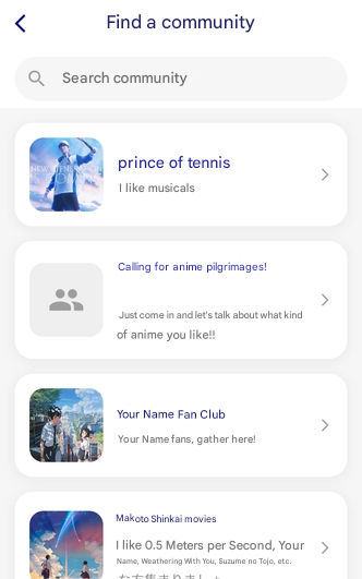 Each anime has its own community space where you can browse photos and tips posted by other fans.