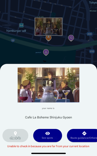 Tap on any pin to open its detail page, where you can view the anime title, a description of the scene, and directions to the spot.