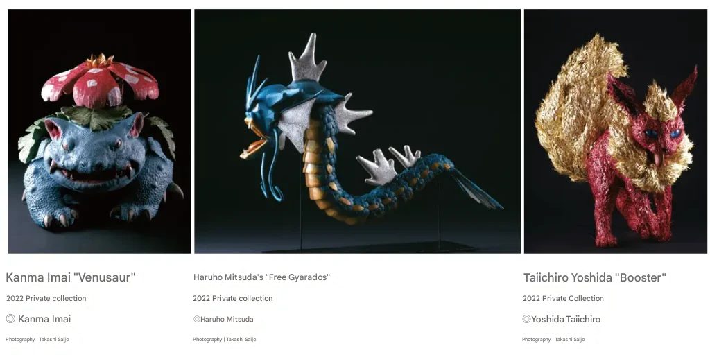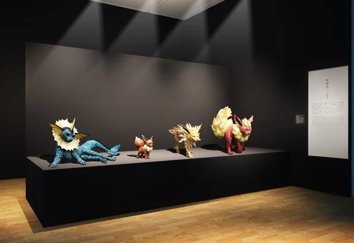 Twenty artists created a total of 80 works, expressing Pokémon through materials such as clay, wood, metal, and textiles.