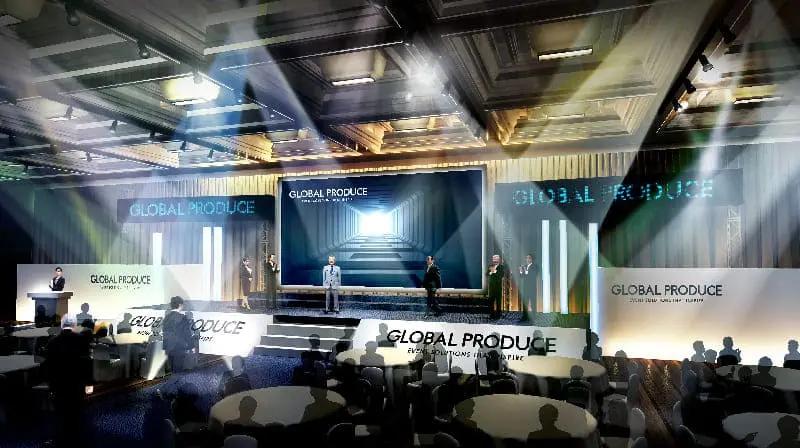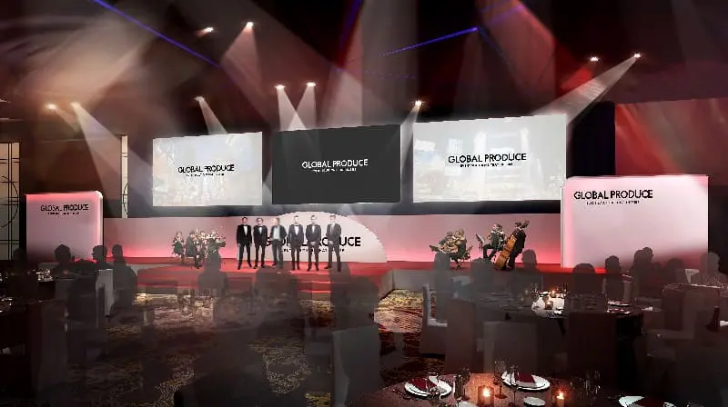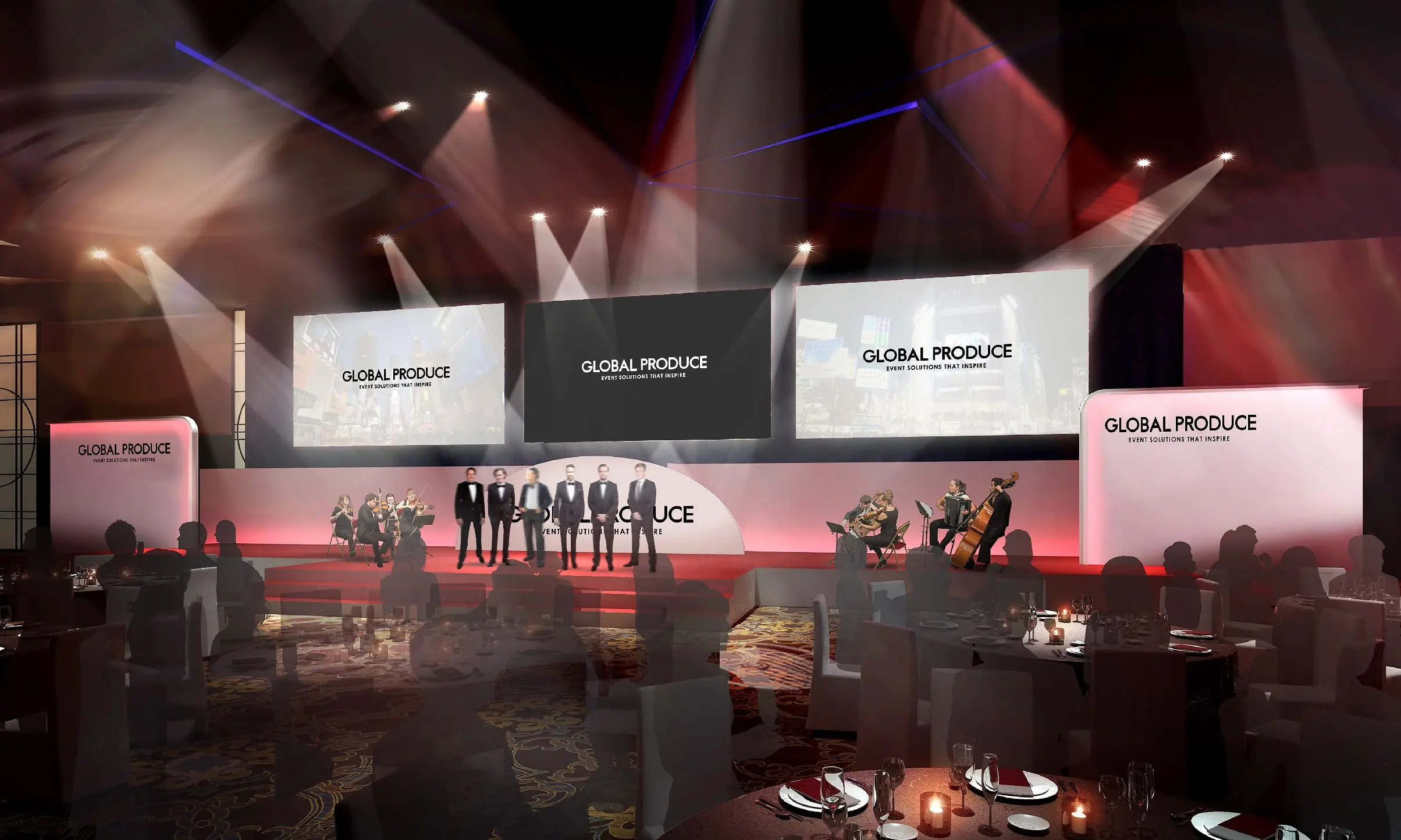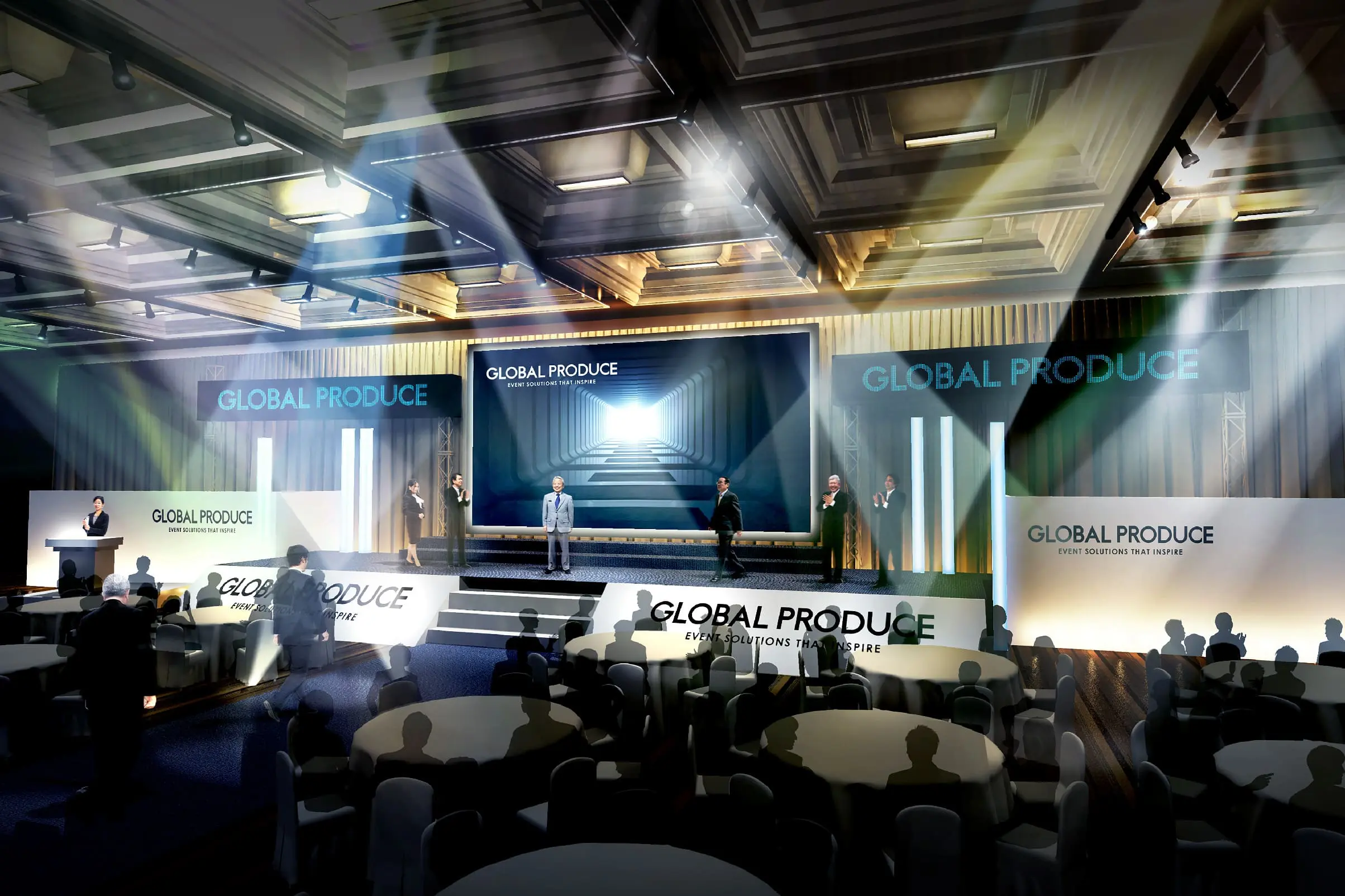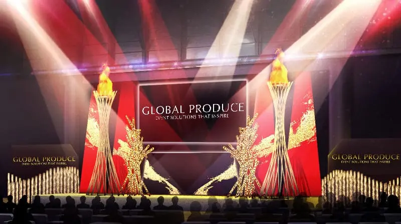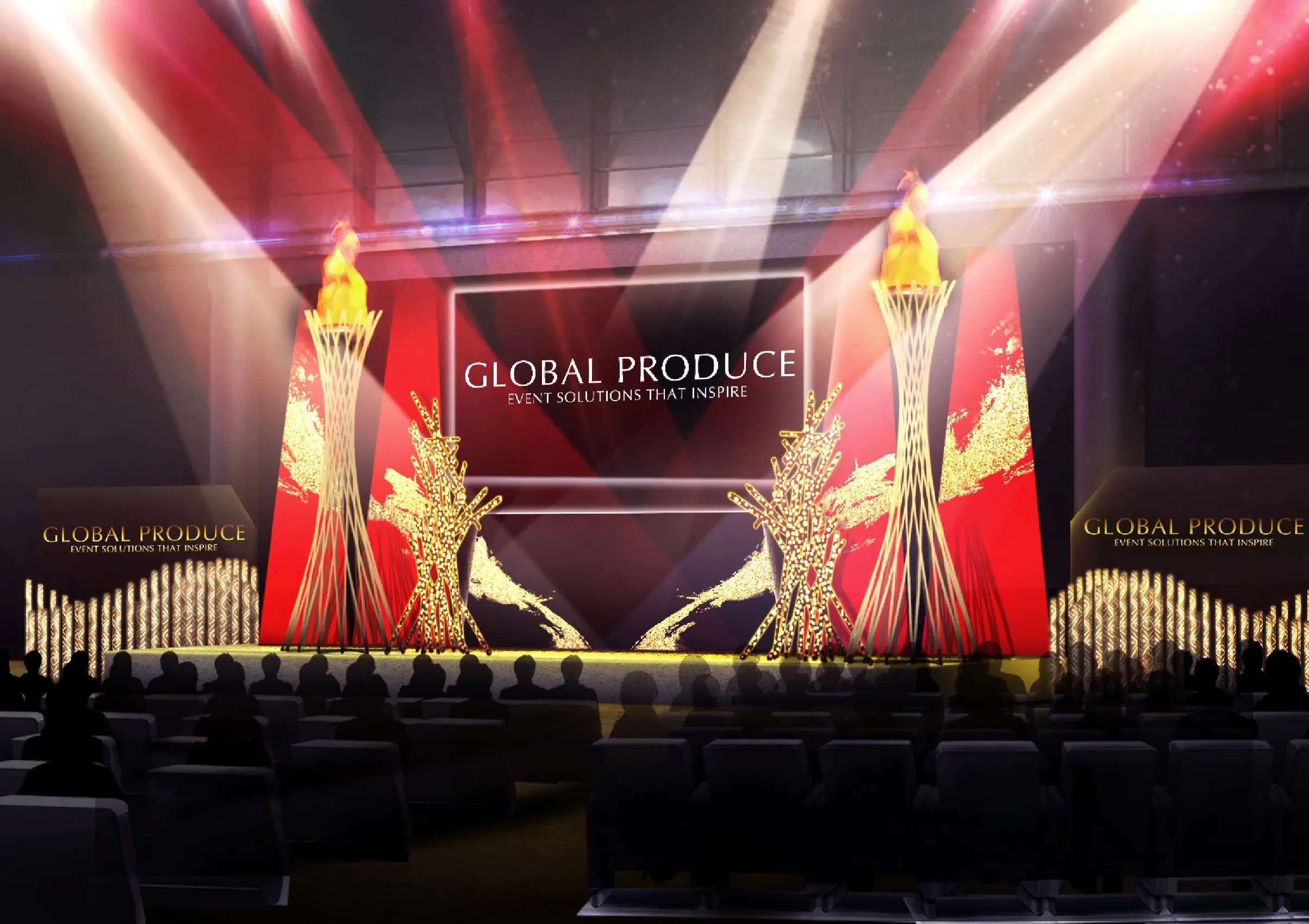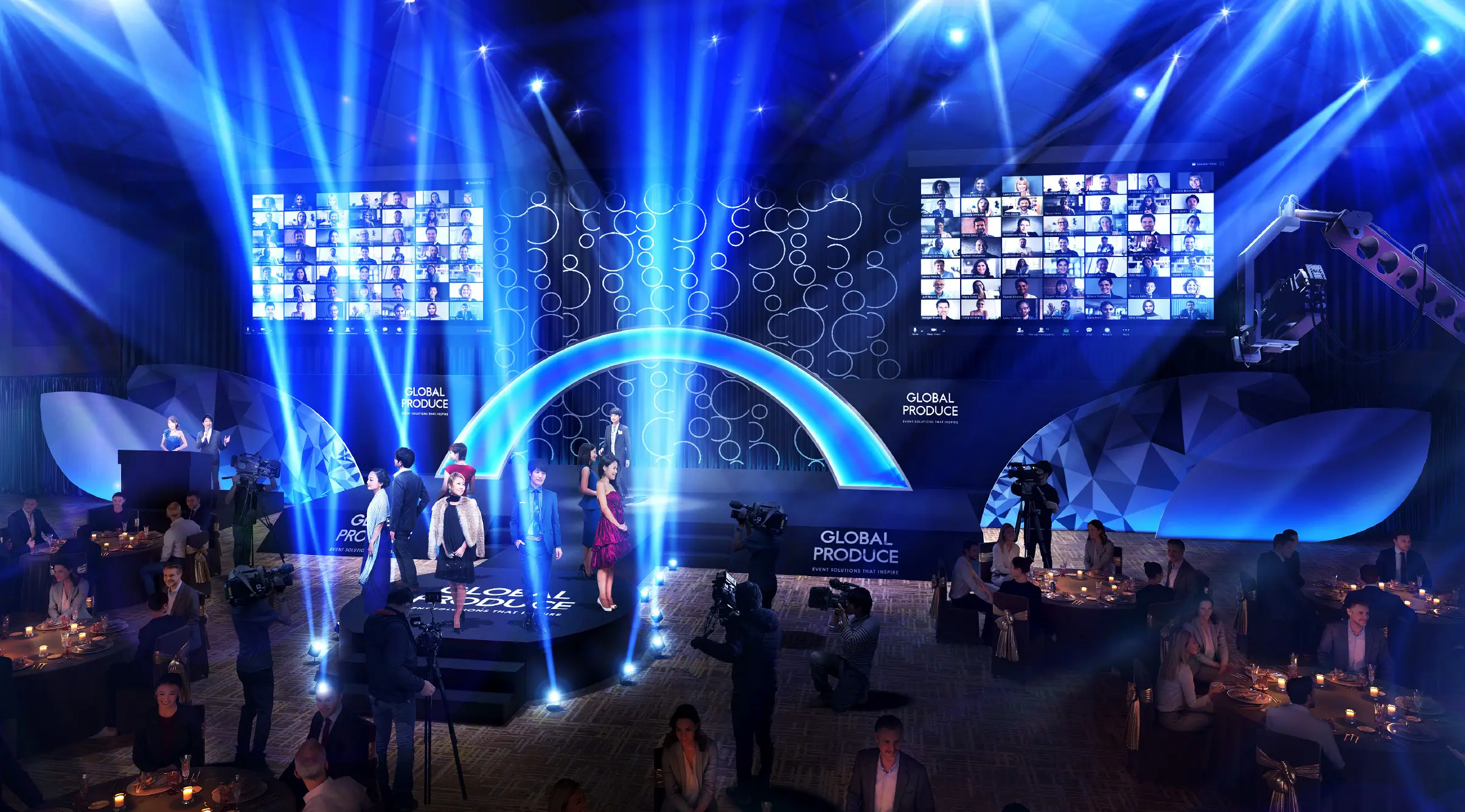 An elegant stage design with a white base. A symbolic object representing the awards is placed at the center. The venue is used horizontally to accommodate a 1000-person theater layout with a screen arrangement that prioritizes visibility.