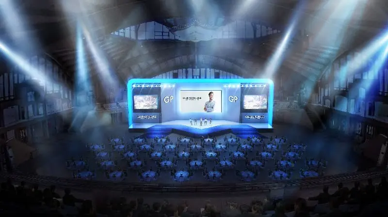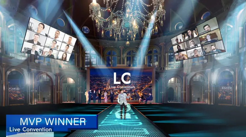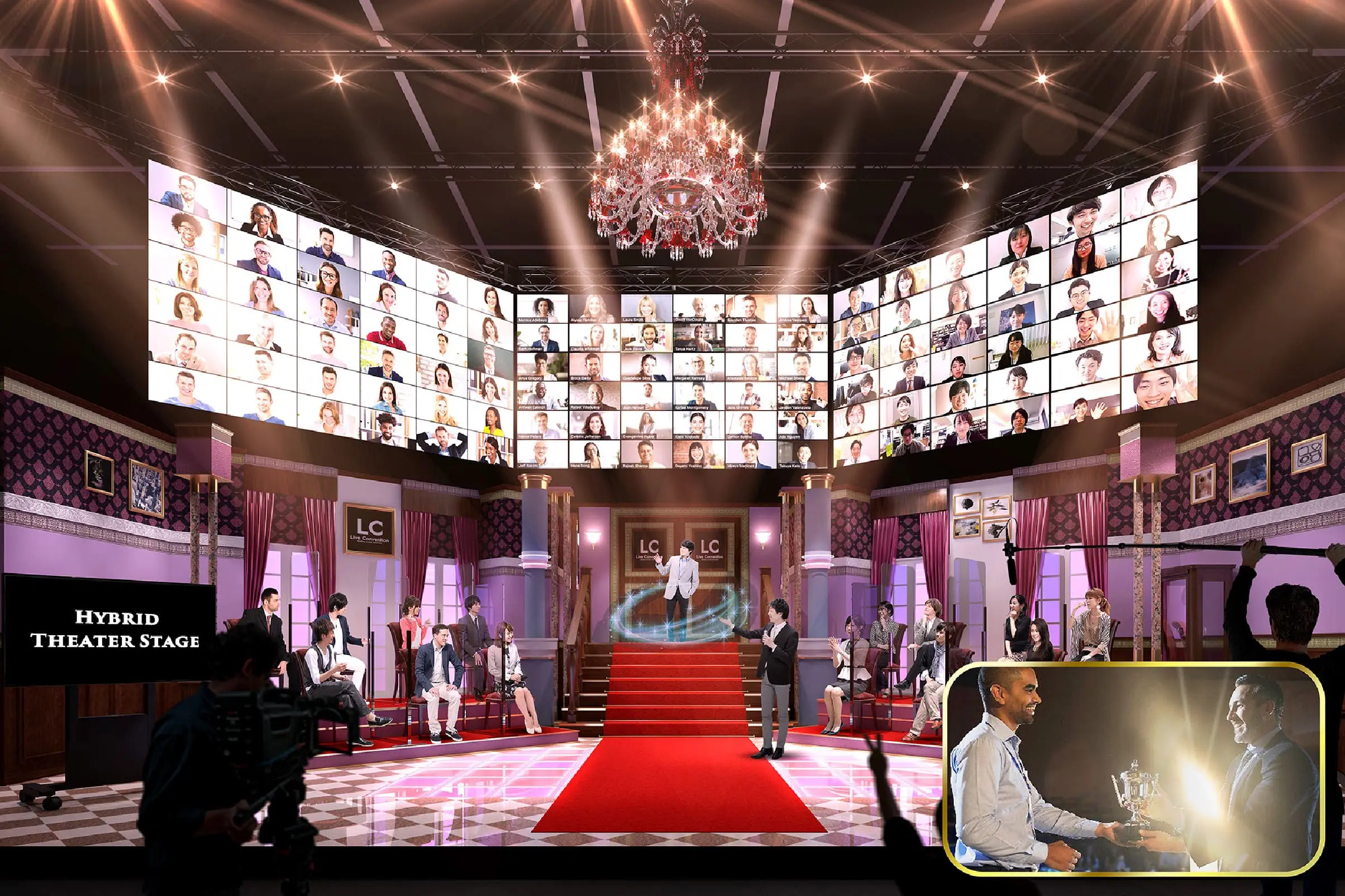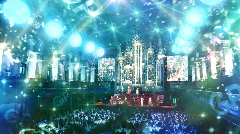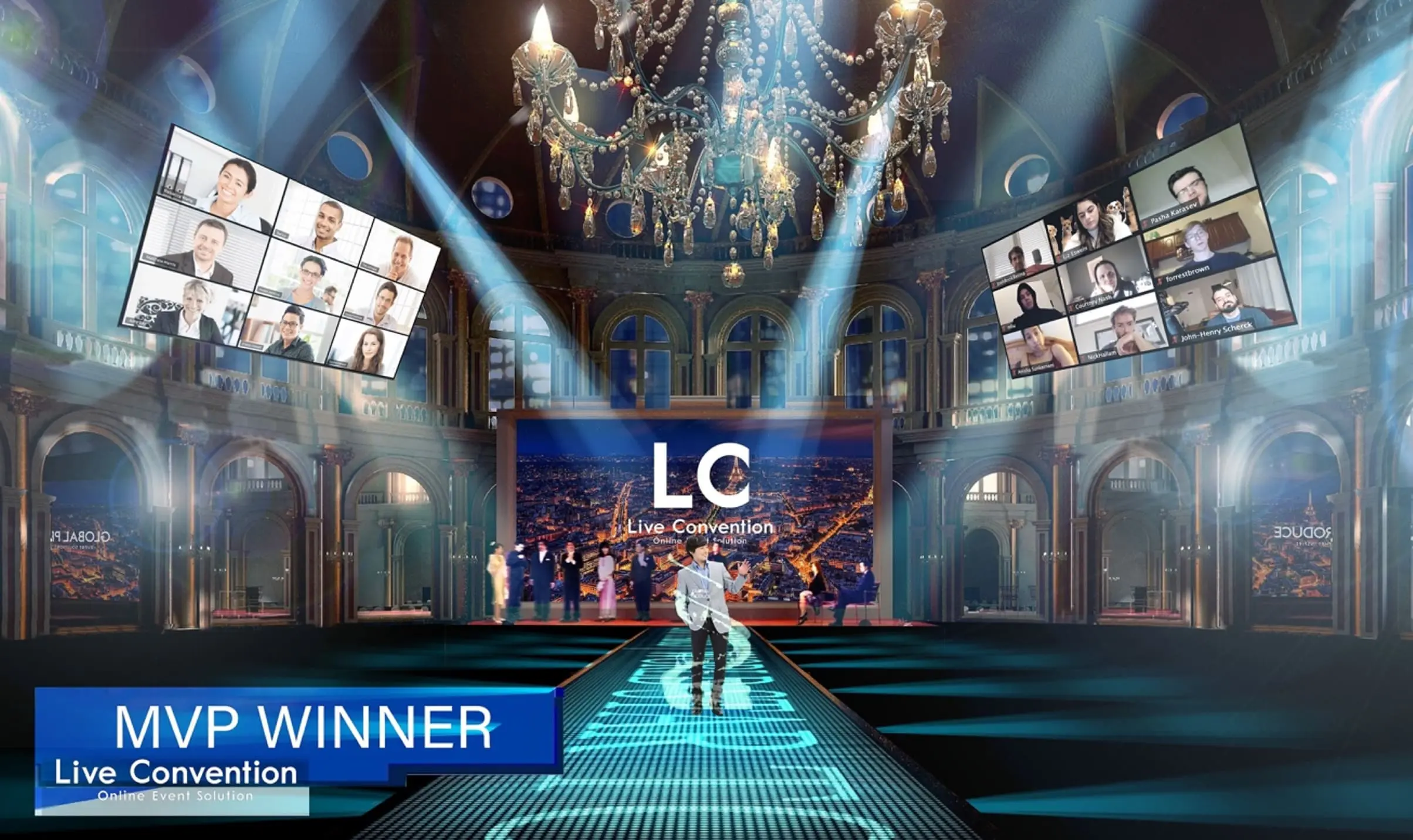 An awards event held in a 3DCG space. The design features a grand and luxurious European architectural space with an LED runway at the center displaying award categories and winners' names.