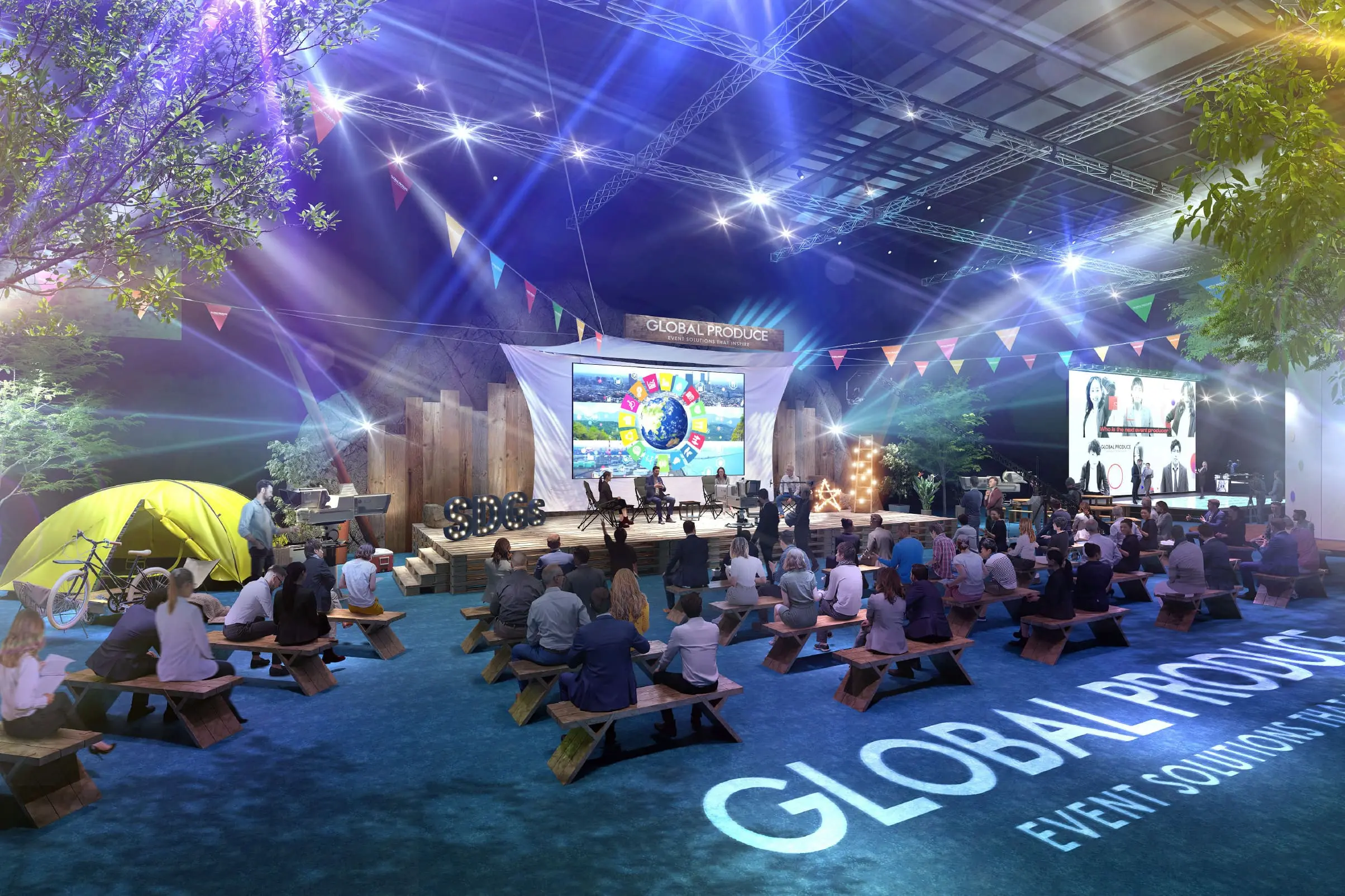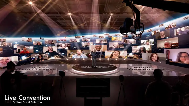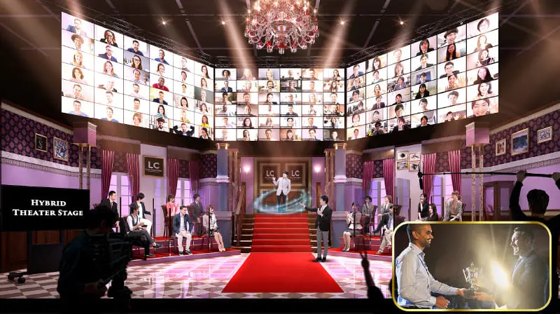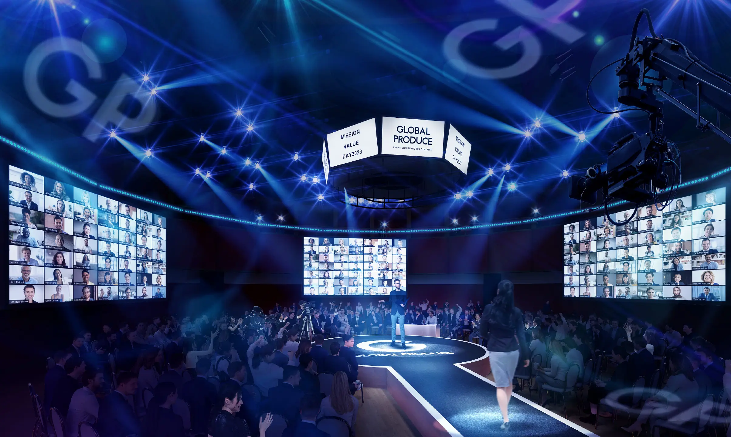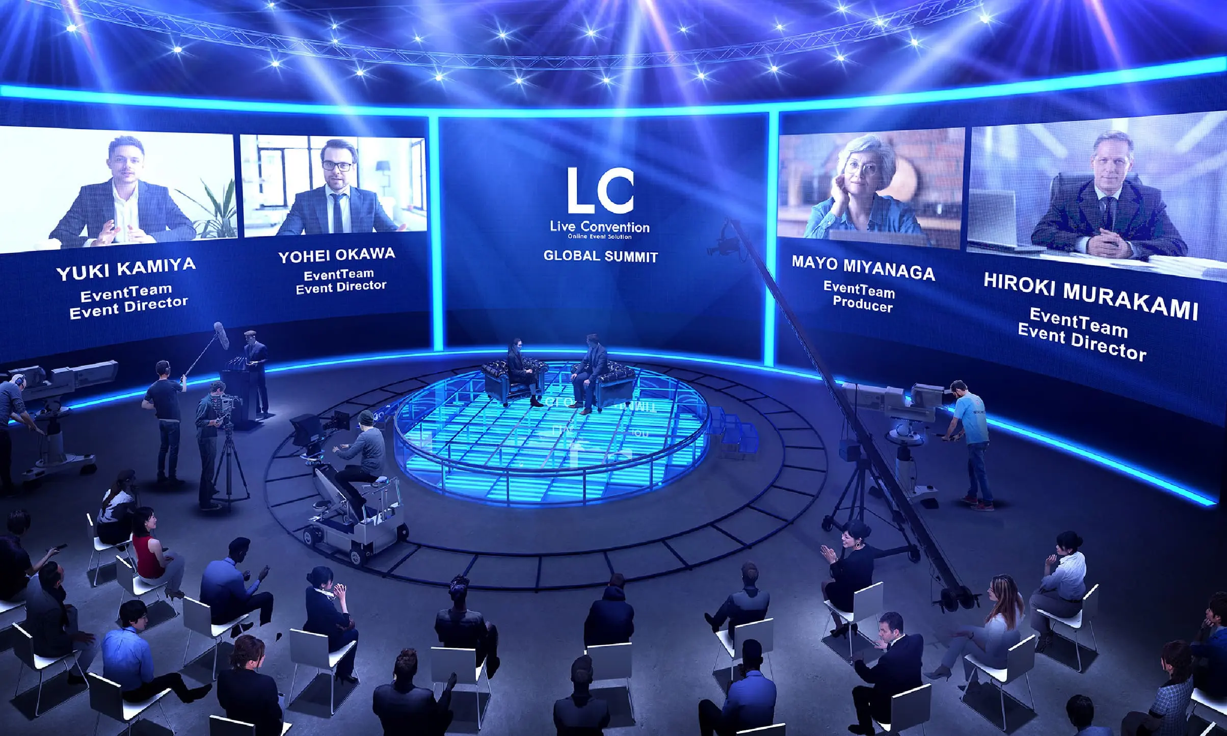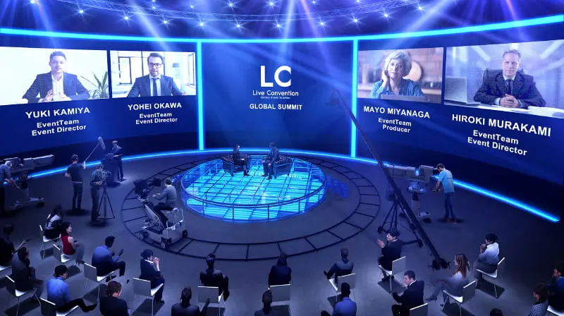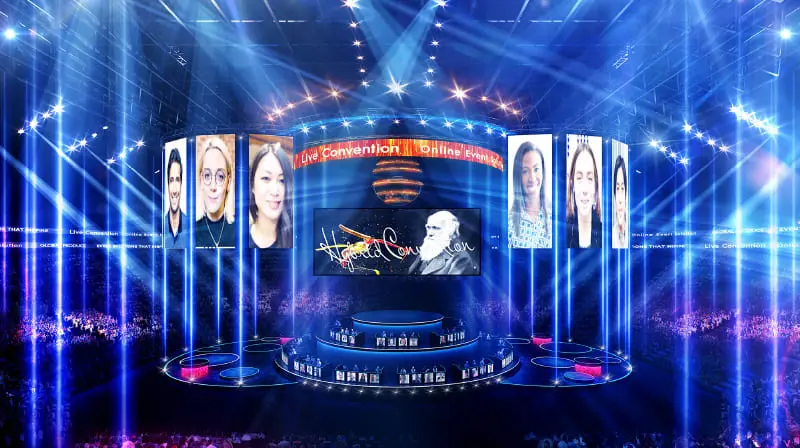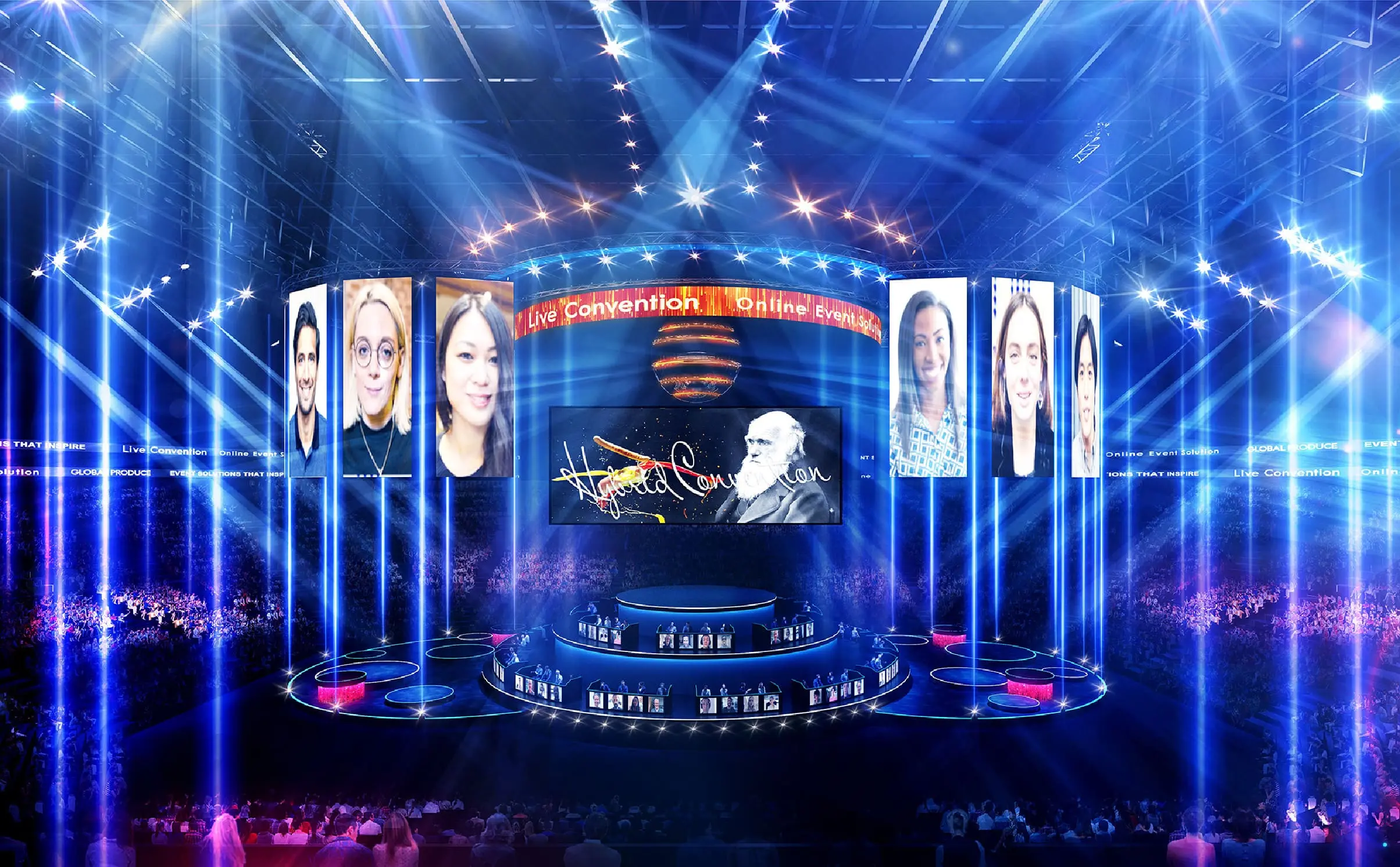 A large-scale, convention-style hybrid event setup. Online speakers are featured on vertical screens displaying web conference feeds, while a circular stage with tiered seating ensures clear views from anywhere in the venue.
