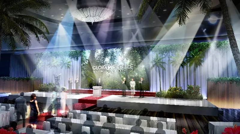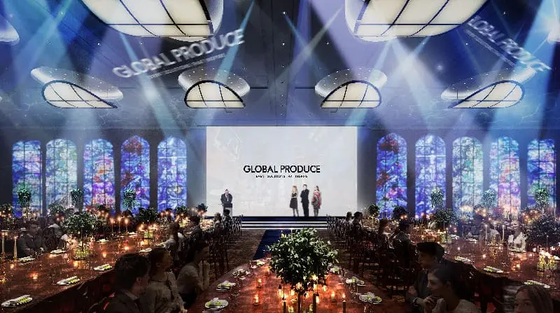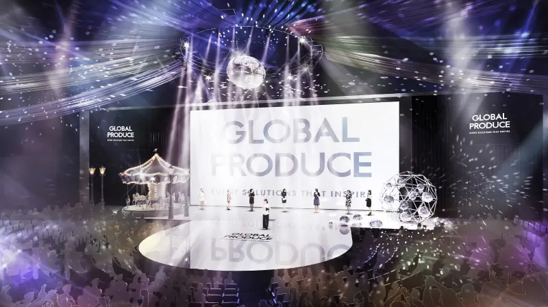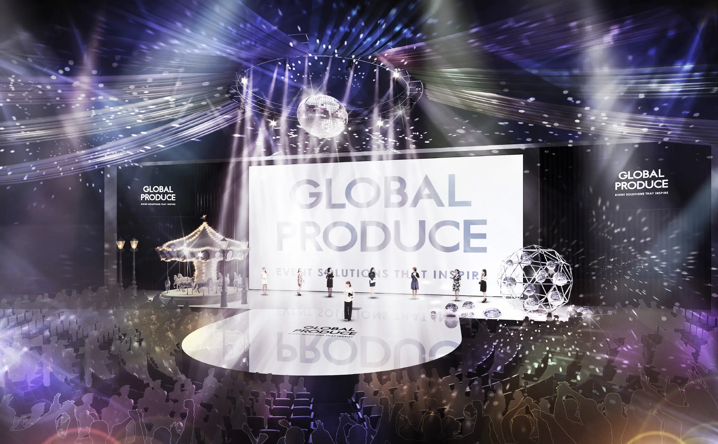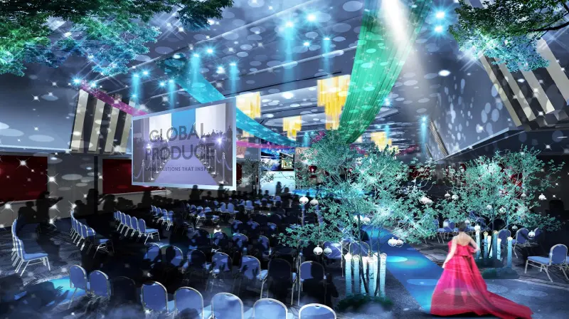 A fantastical awards ceremony featuring a merry-go-round and mirror balls. The rotatable merry-go-round and reflections from the illuminated mirror balls create a fantasy-like atmosphere.