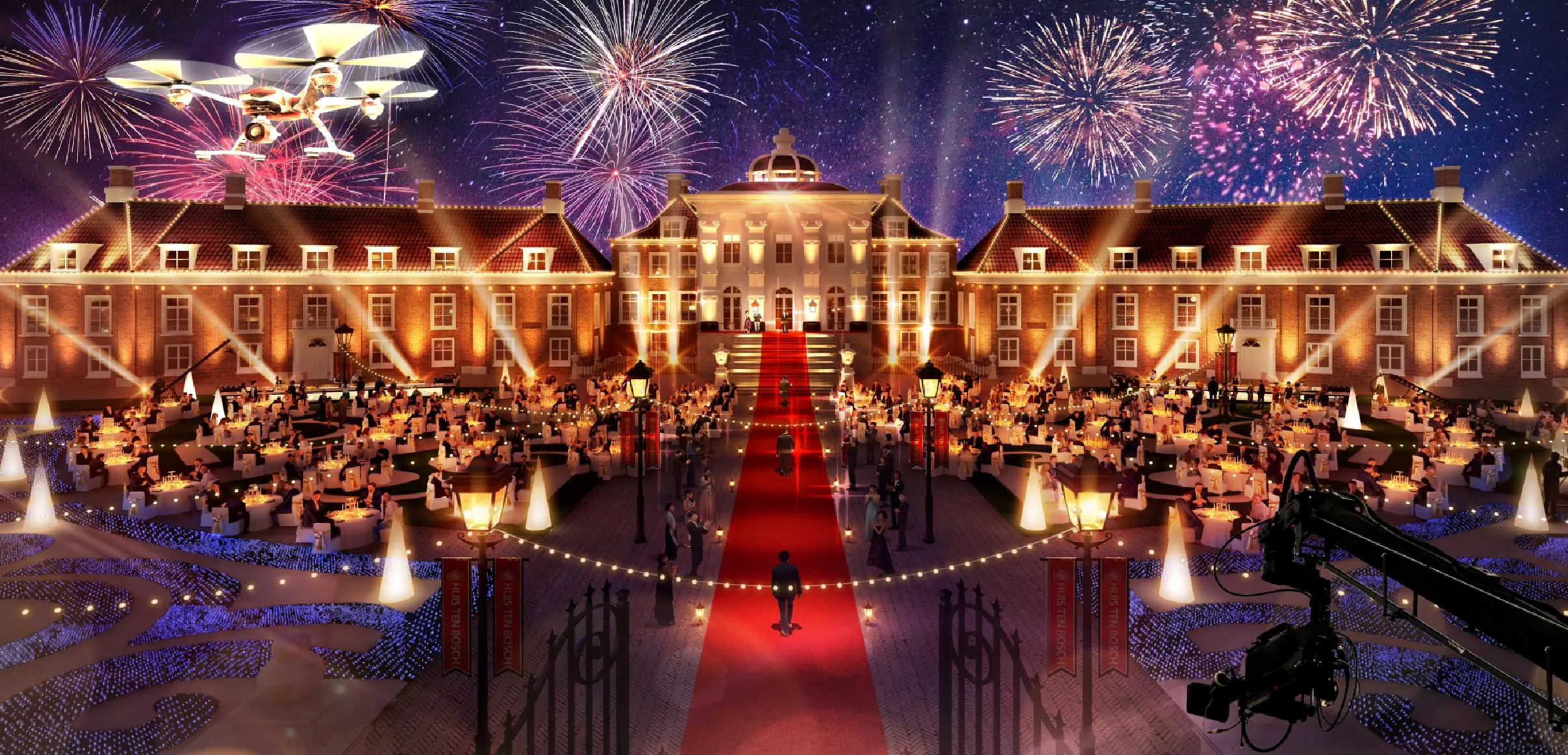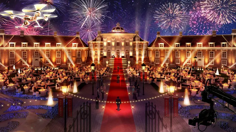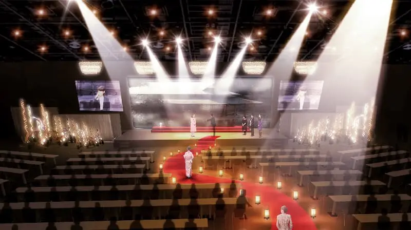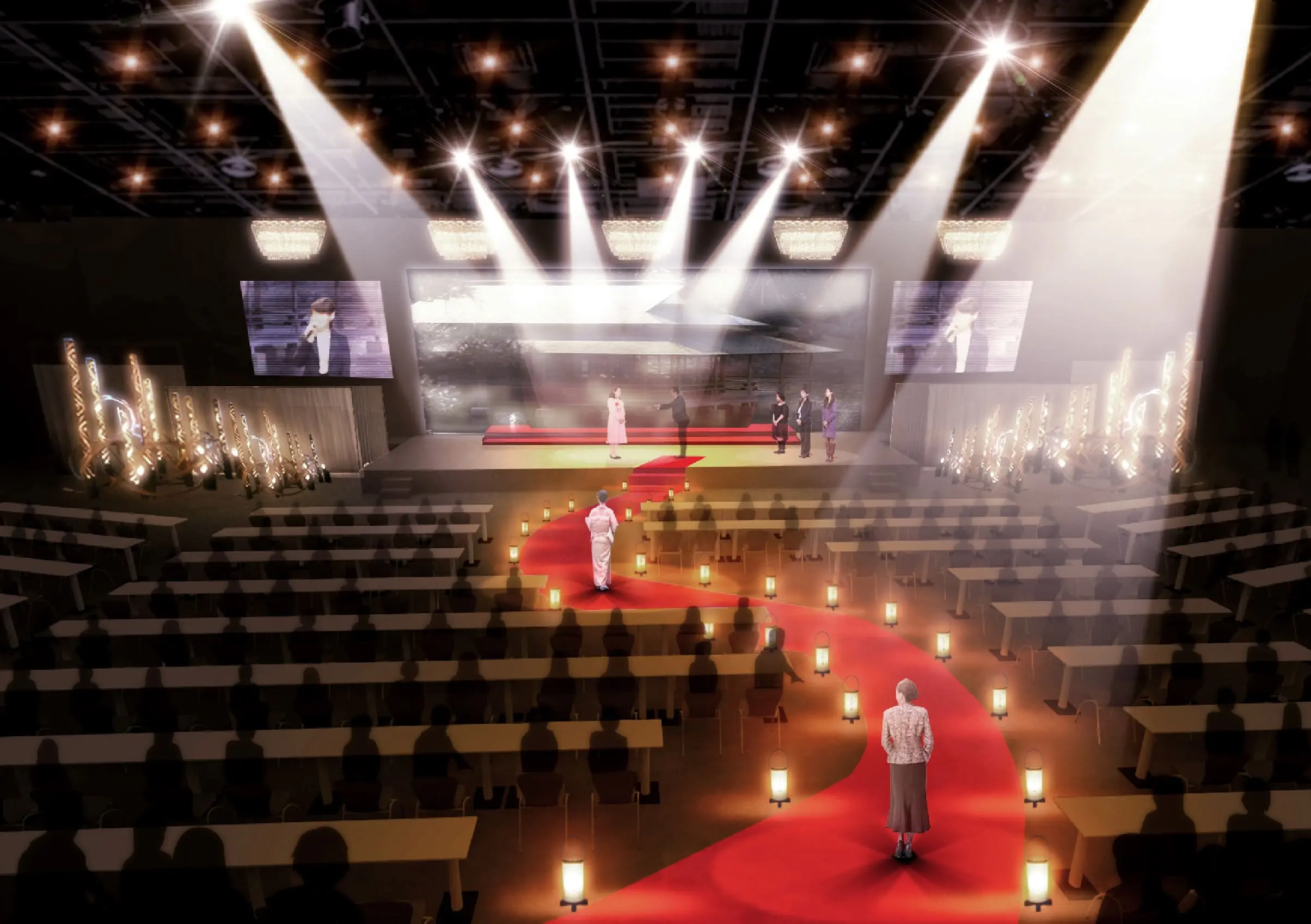 A glamorous awards presentation set against the backdrop of a palace. It features a luxurious ambiance reminiscent of an overseas garden party and a striking red carpet. Projection mapping on the entire building creates a magnificent atmosphere.