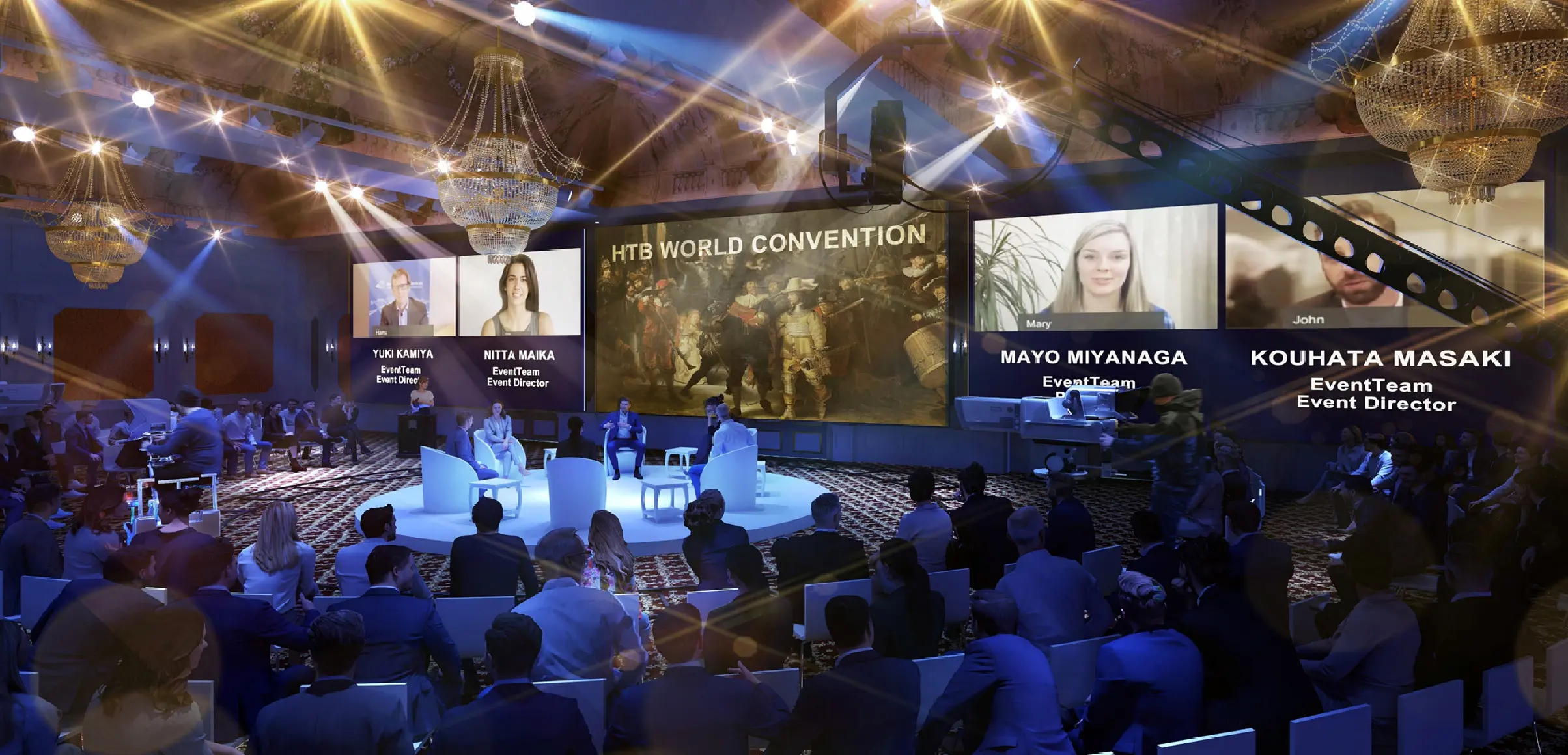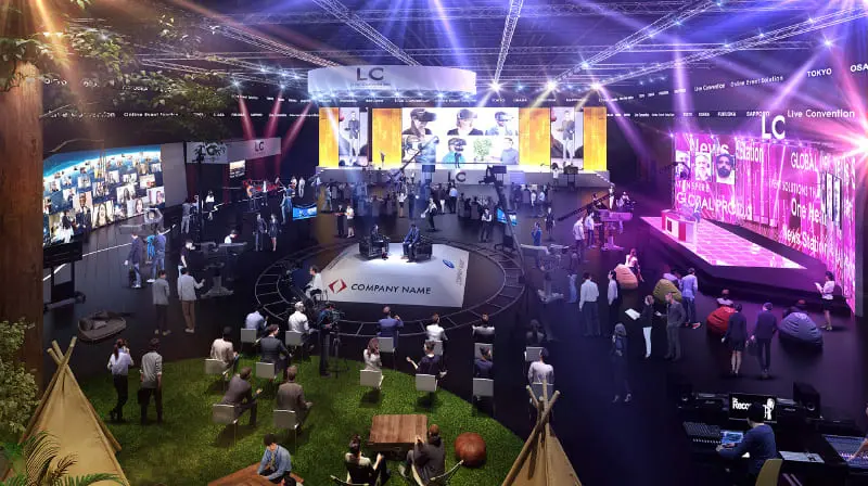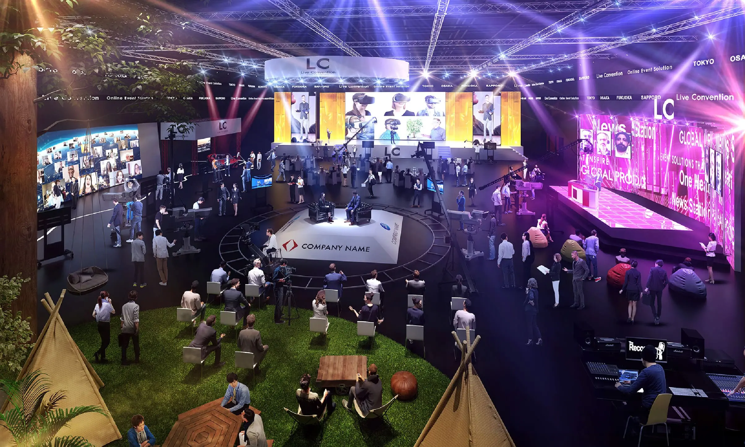 A hybrid event hosting multiple contents simultaneously. Inside, a variety of activities like exhibitions and talk sessions take place at different booths, allowing participants to freely move between them.