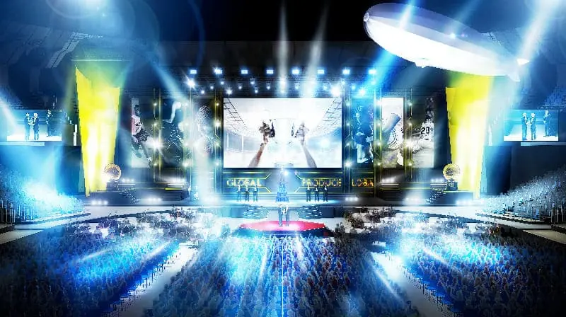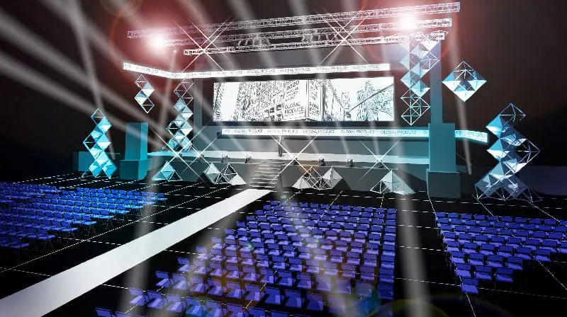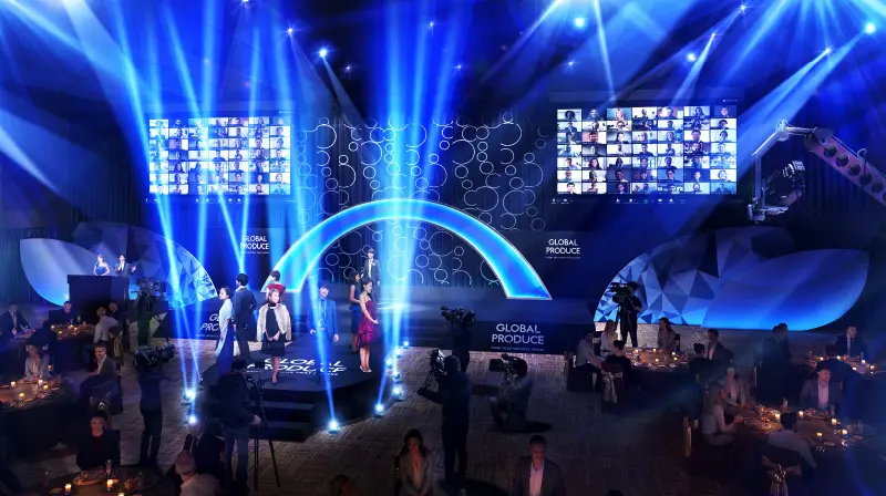 An awards ceremony setup with a focus on realism, resembling a TV program with tiered seating and a backdrop set. Above the set, three screens display attendees in a gallery view. Awardees walk a central red carpet to the stage.