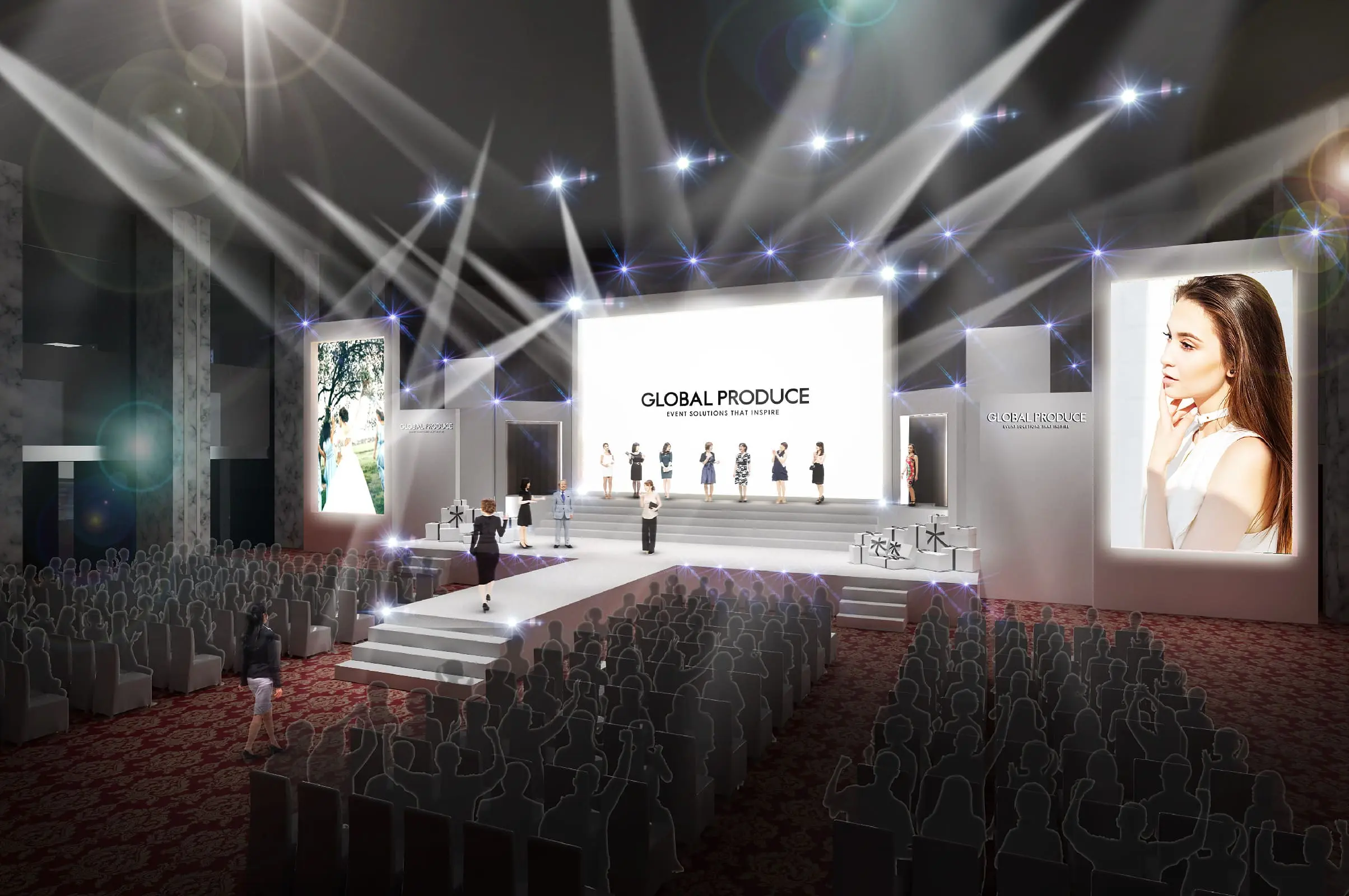 A simple and sophisticated space inspired by a fashion show. Lighting equipment placed alongside the runway creates pillars of light, enabling three-dimensional effects.