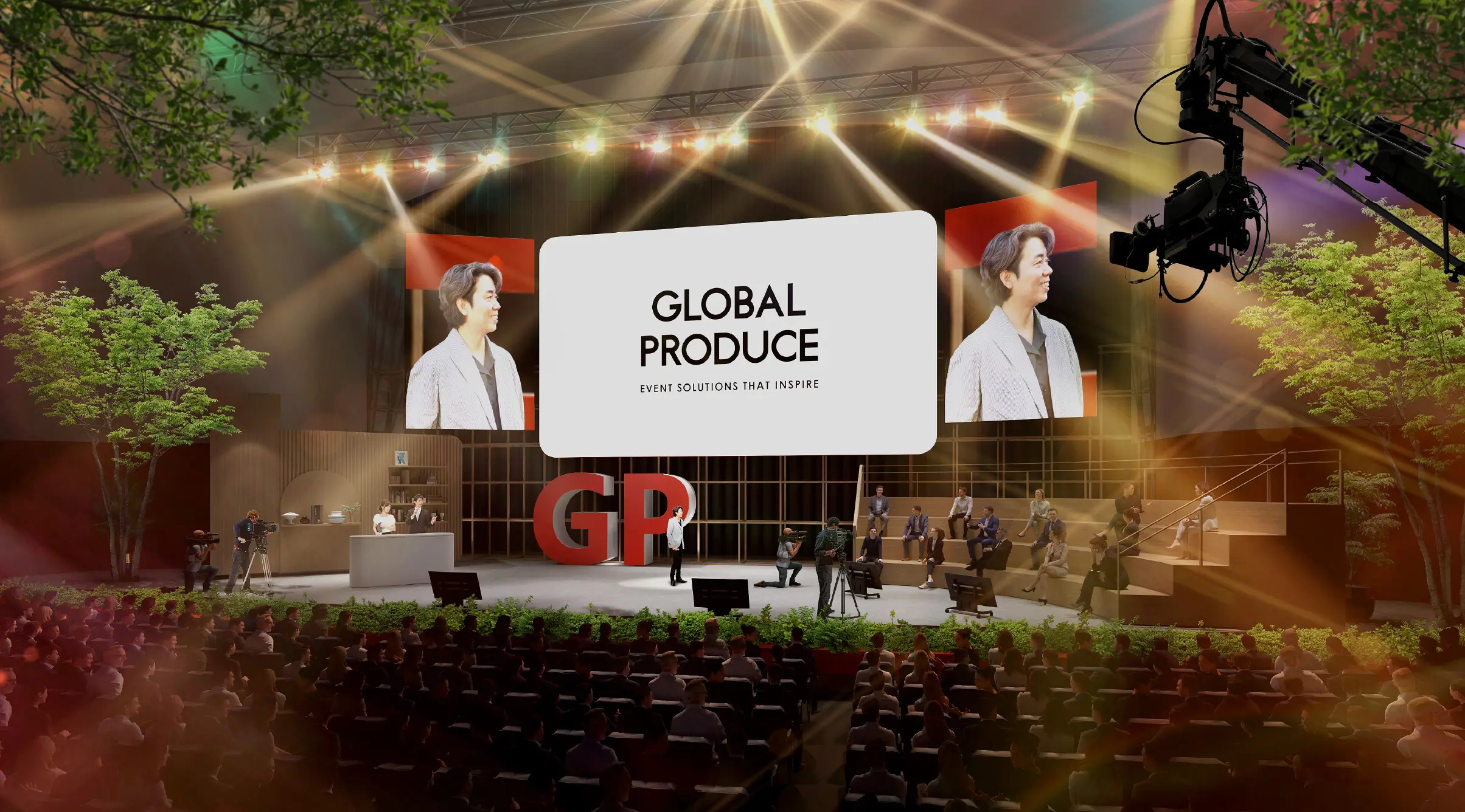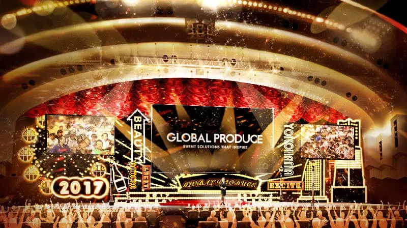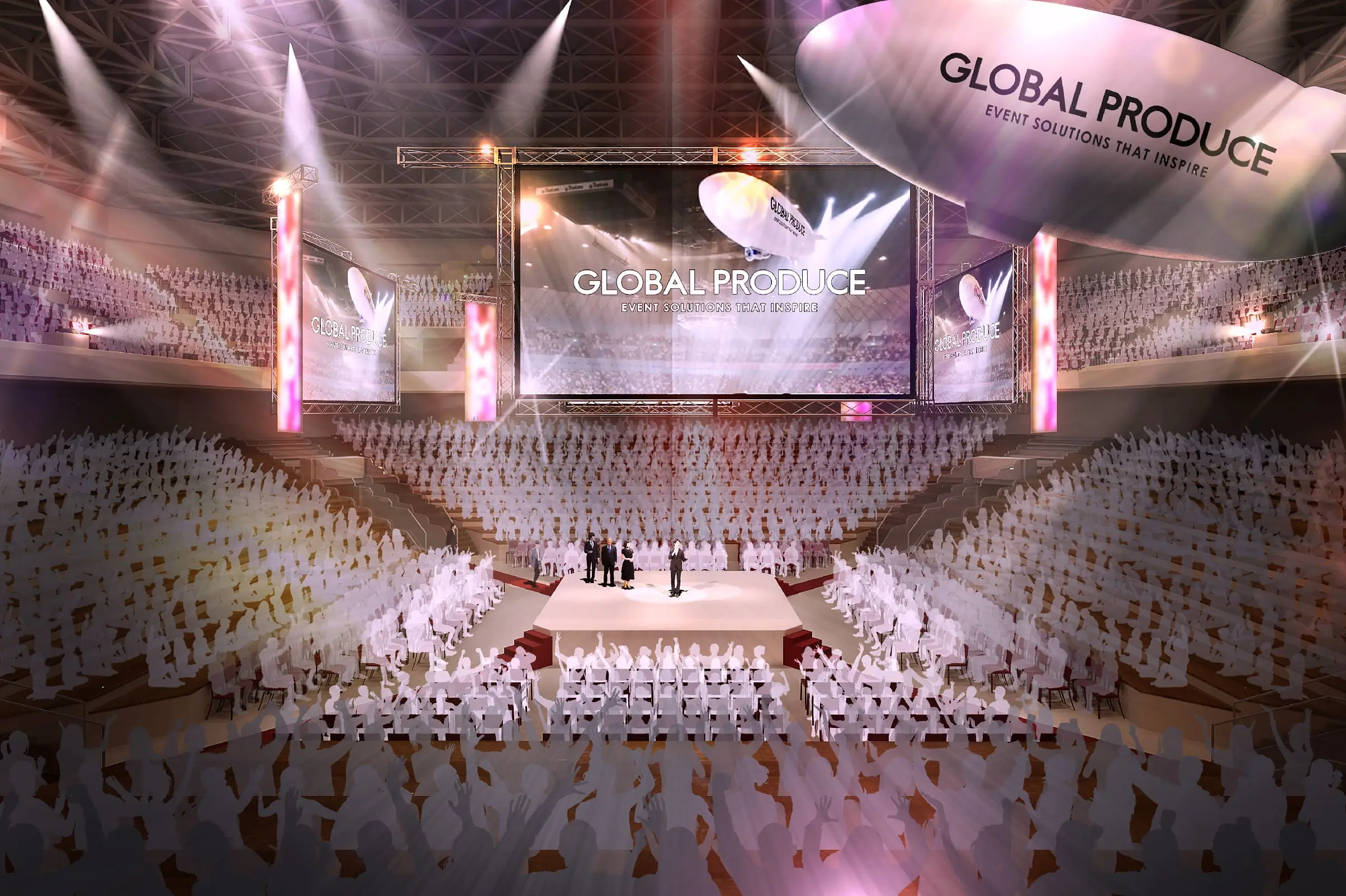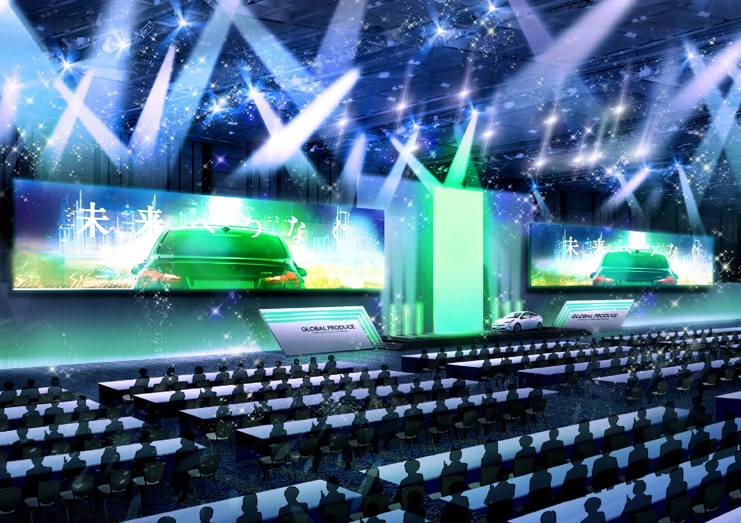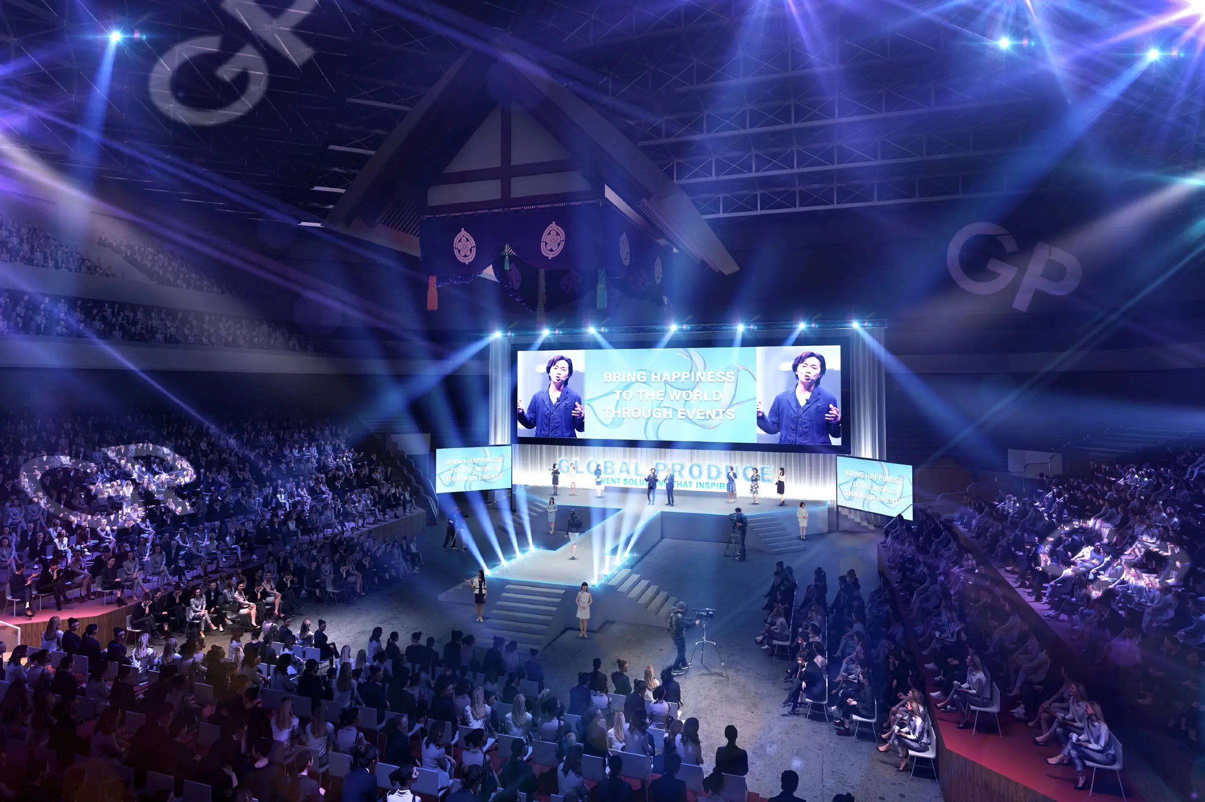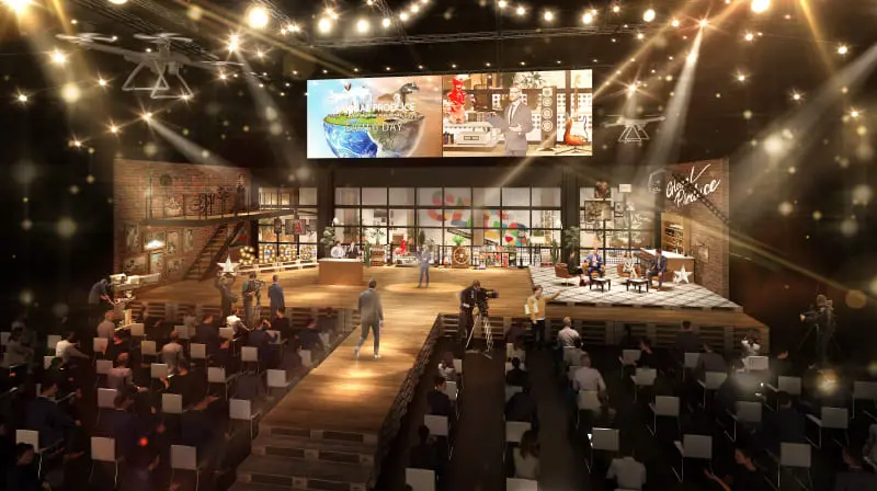 At PACIFICO Yokohama National Convention Hall. The venue's cyclorama curtain is used as a large screen, and a movable scaffolding structure displays the event's key concepts, creating a dynamic and impactful presentation.