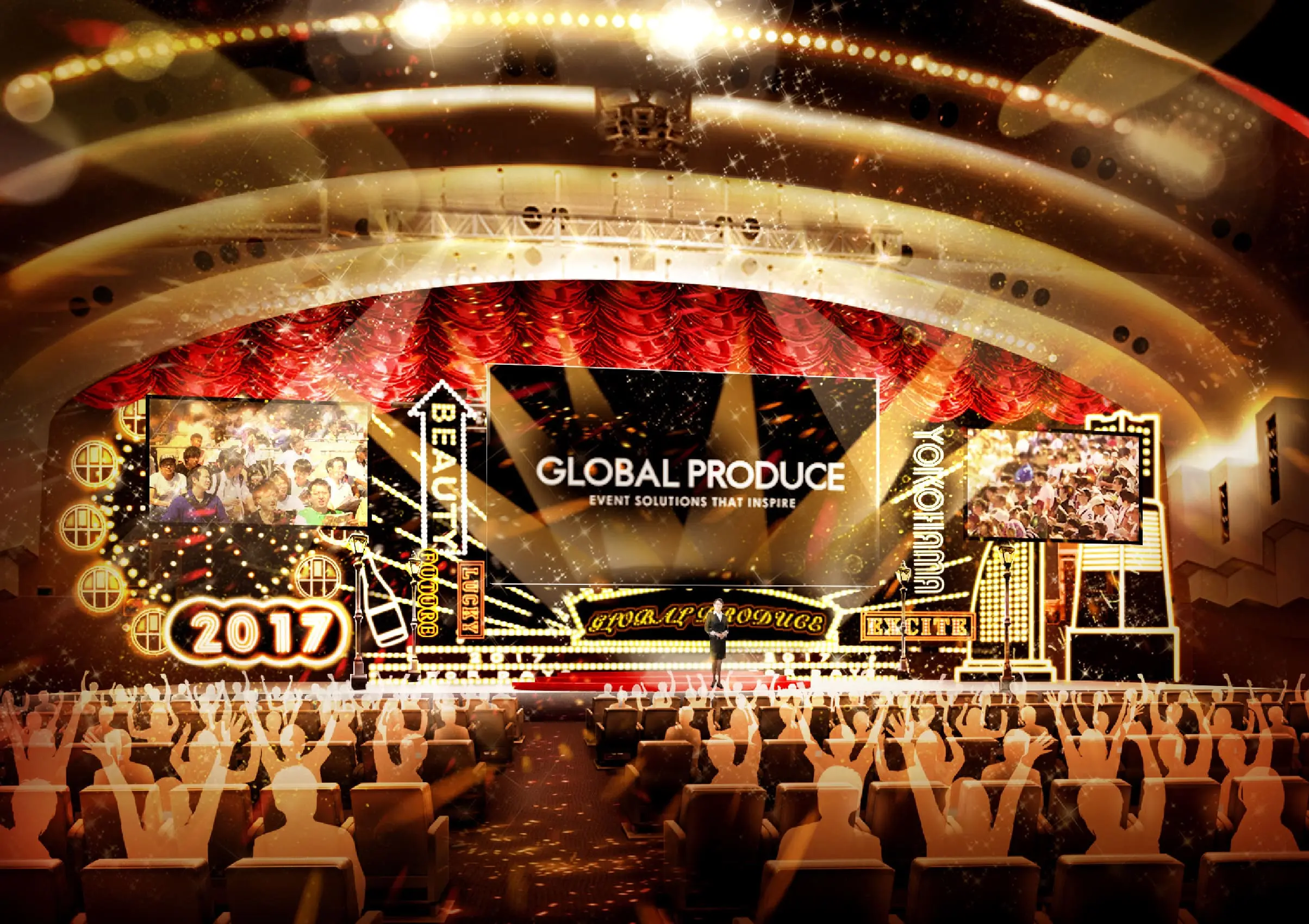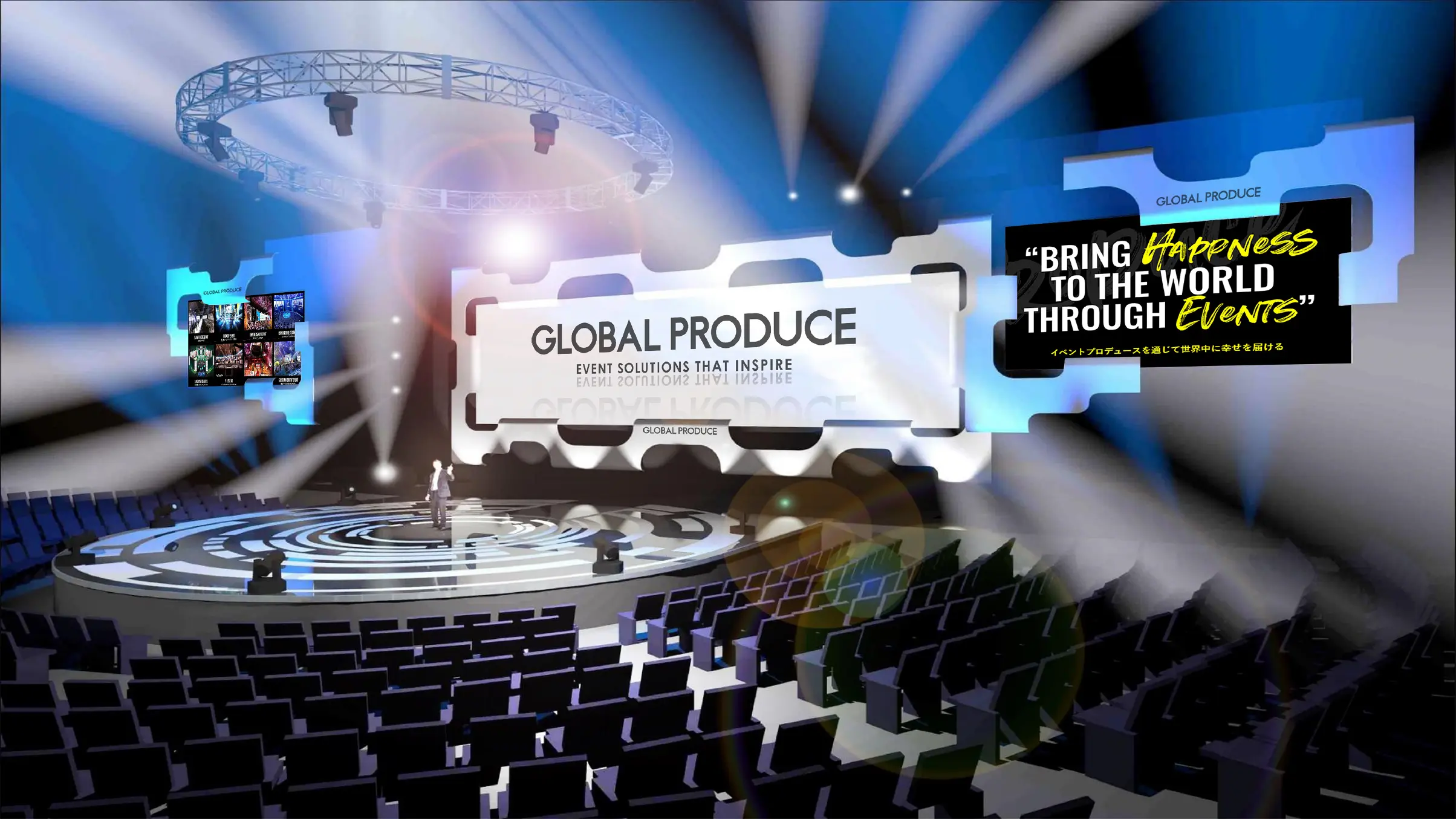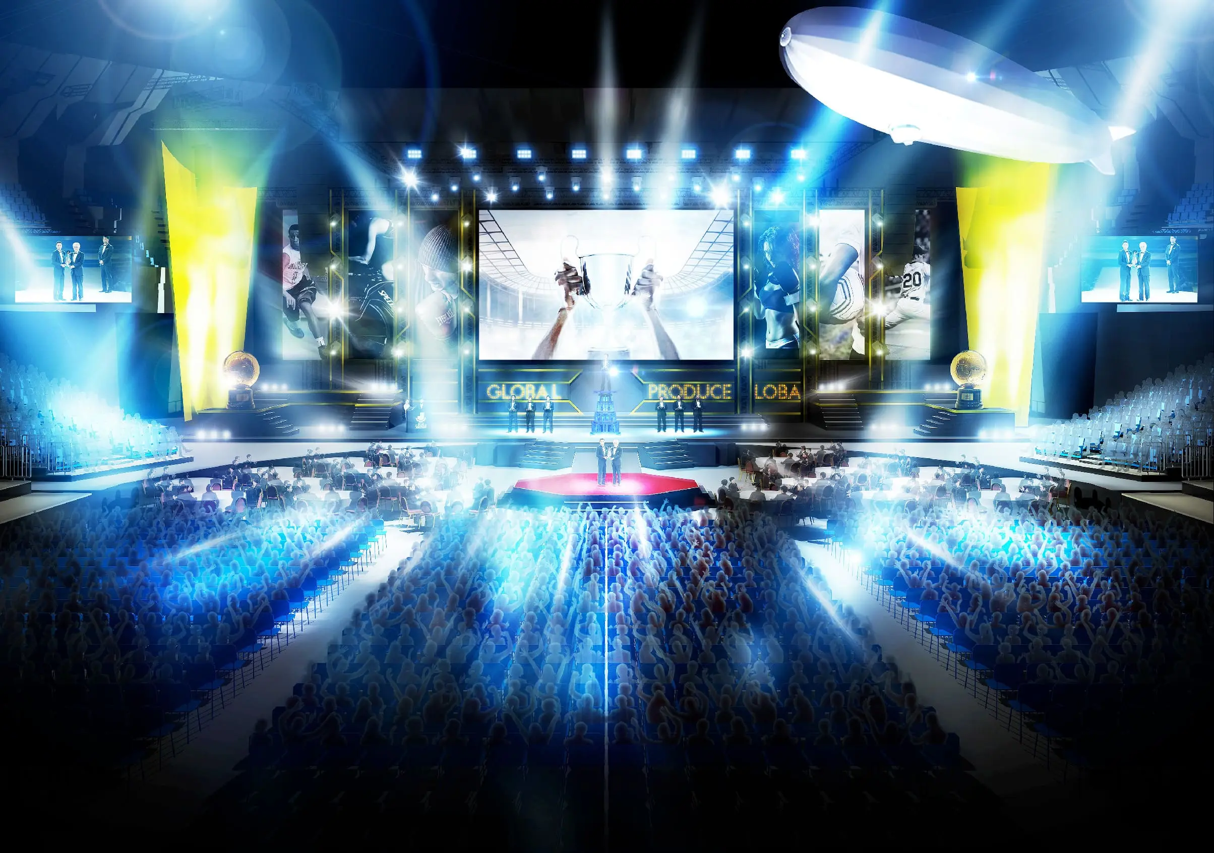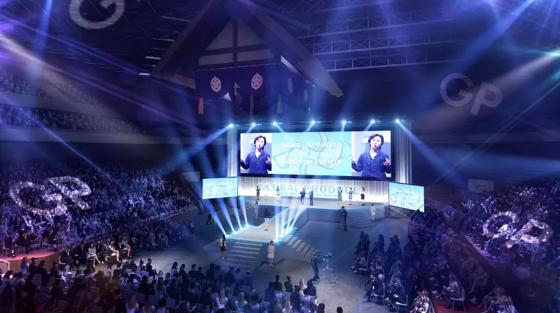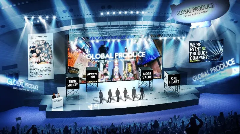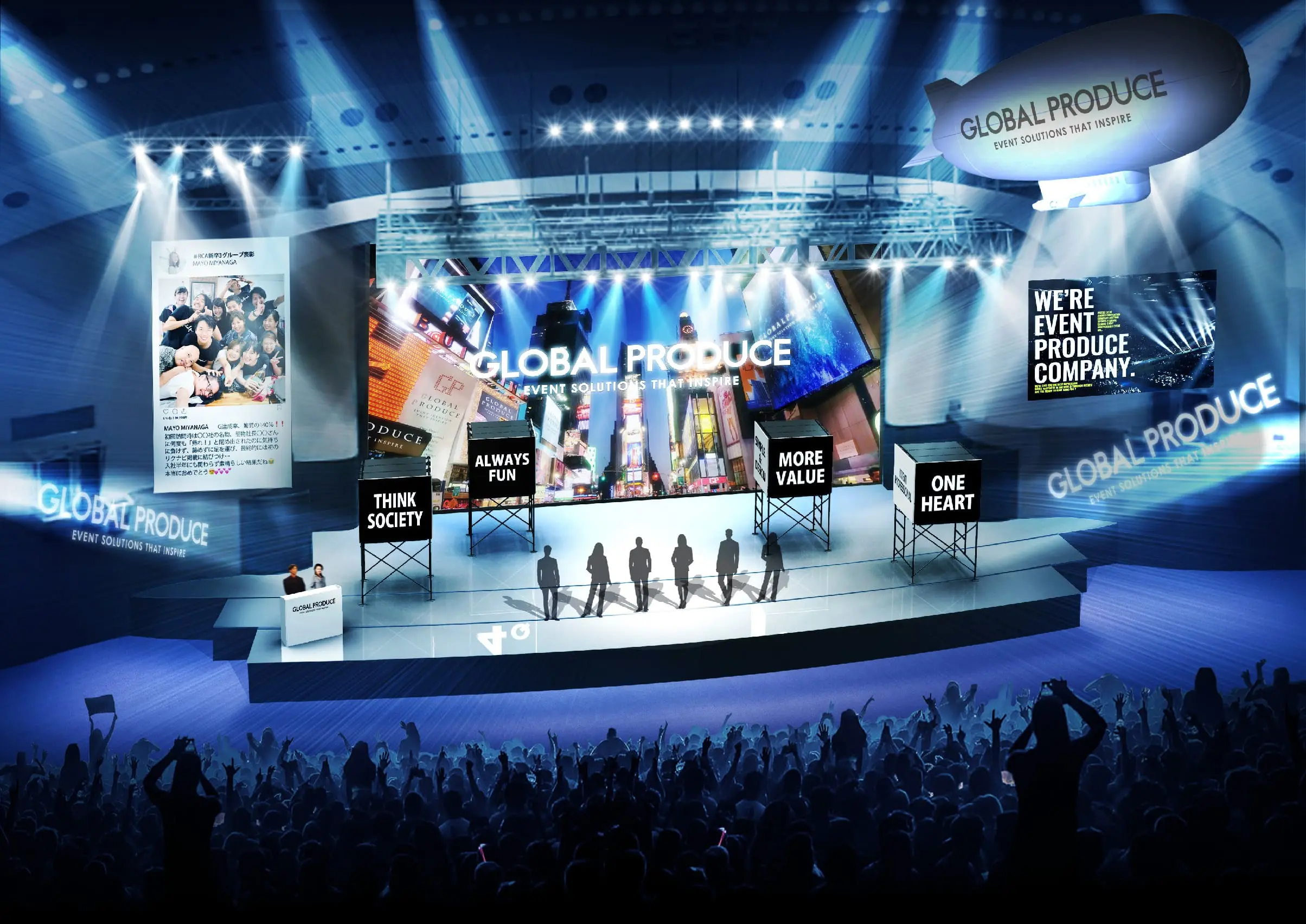 At PACIFICO Yokohama National Convention Hall. The venue's cyclorama curtain is used as a large screen, and a movable scaffolding structure displays the event's key concepts, creating a dynamic and impactful presentation.