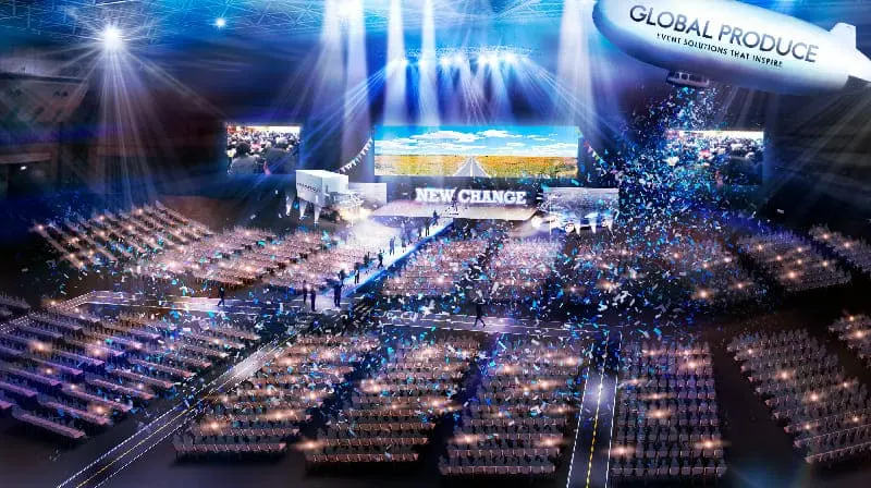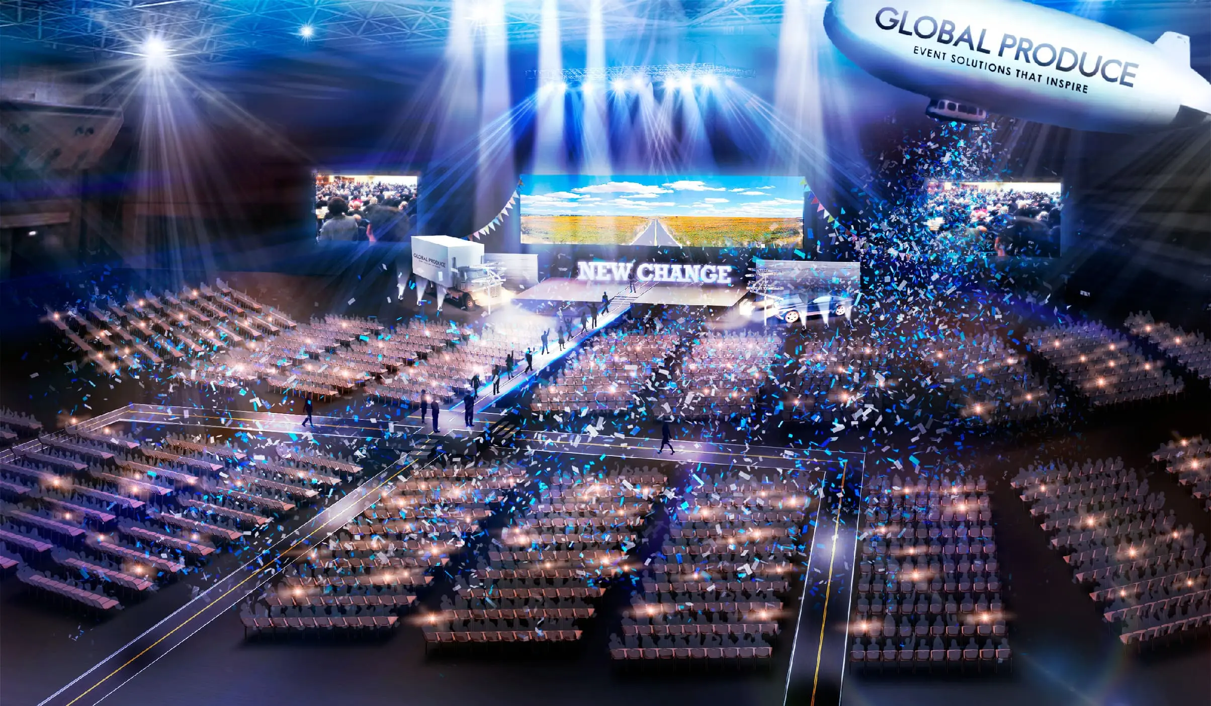 A design that makes you feel like you are racing across a frontier. The stage feels close from anywhere in the venue. A sub-stage fosters a sense of "one team" throughout the space. A giant truck and a Mustang are placed on either side of the stage.