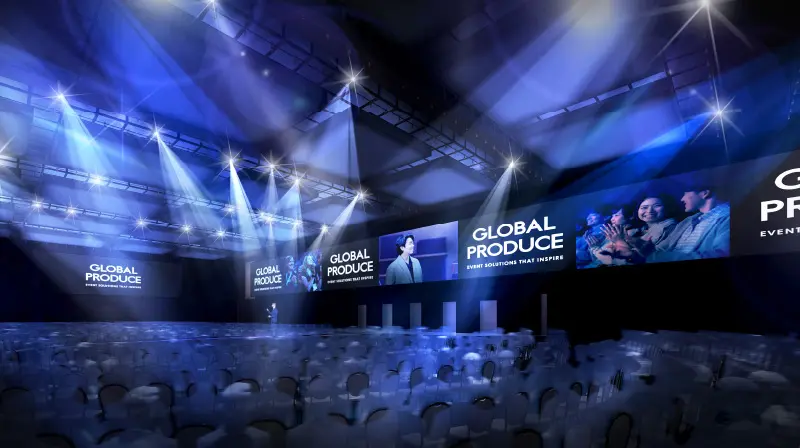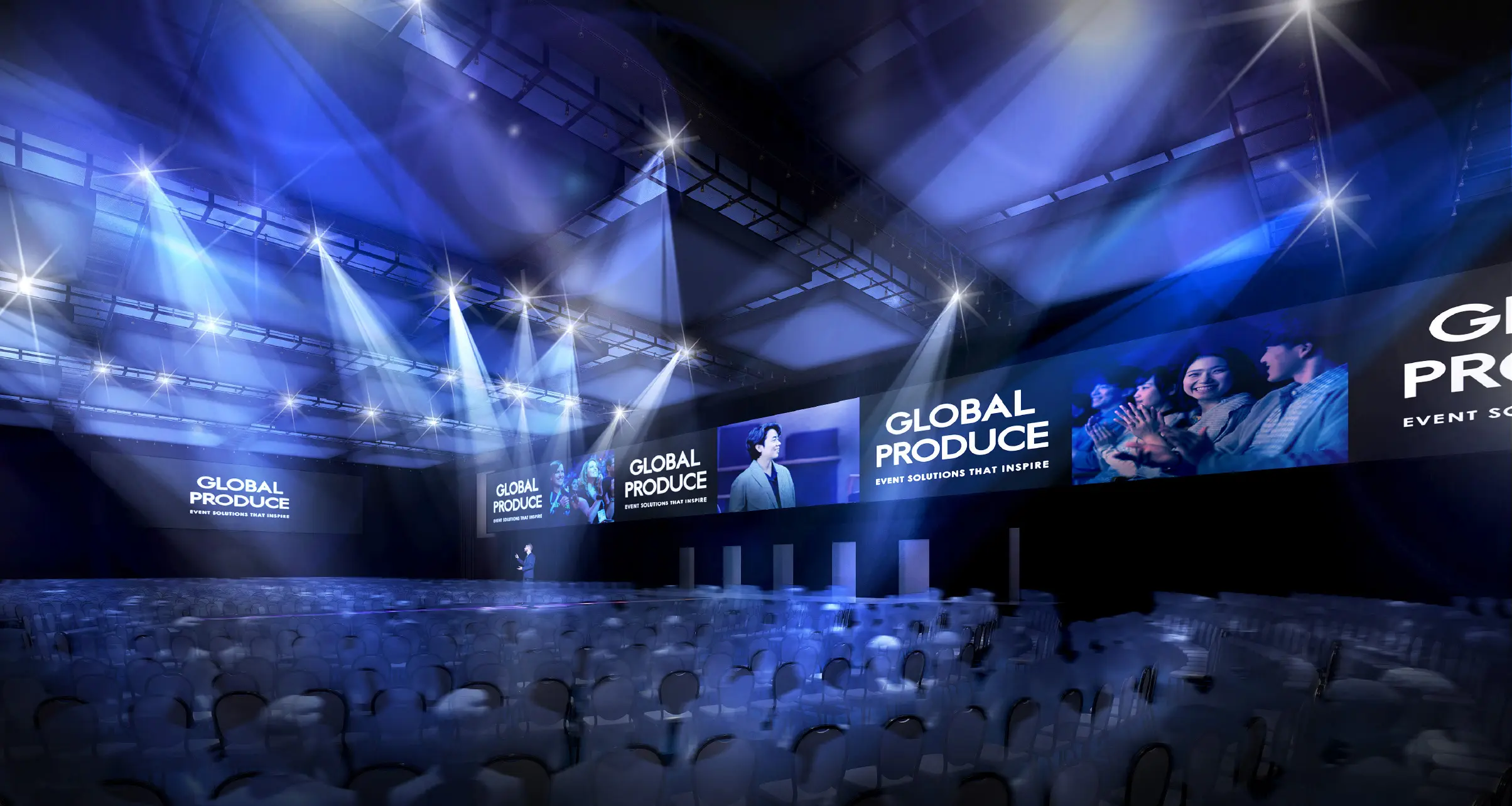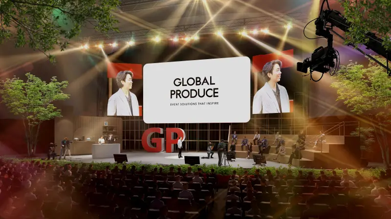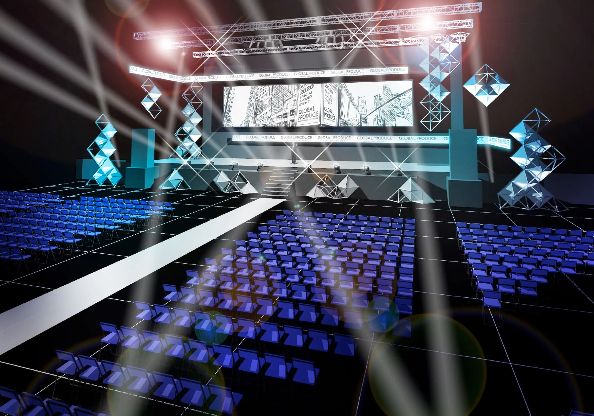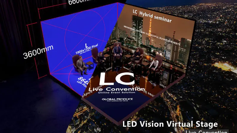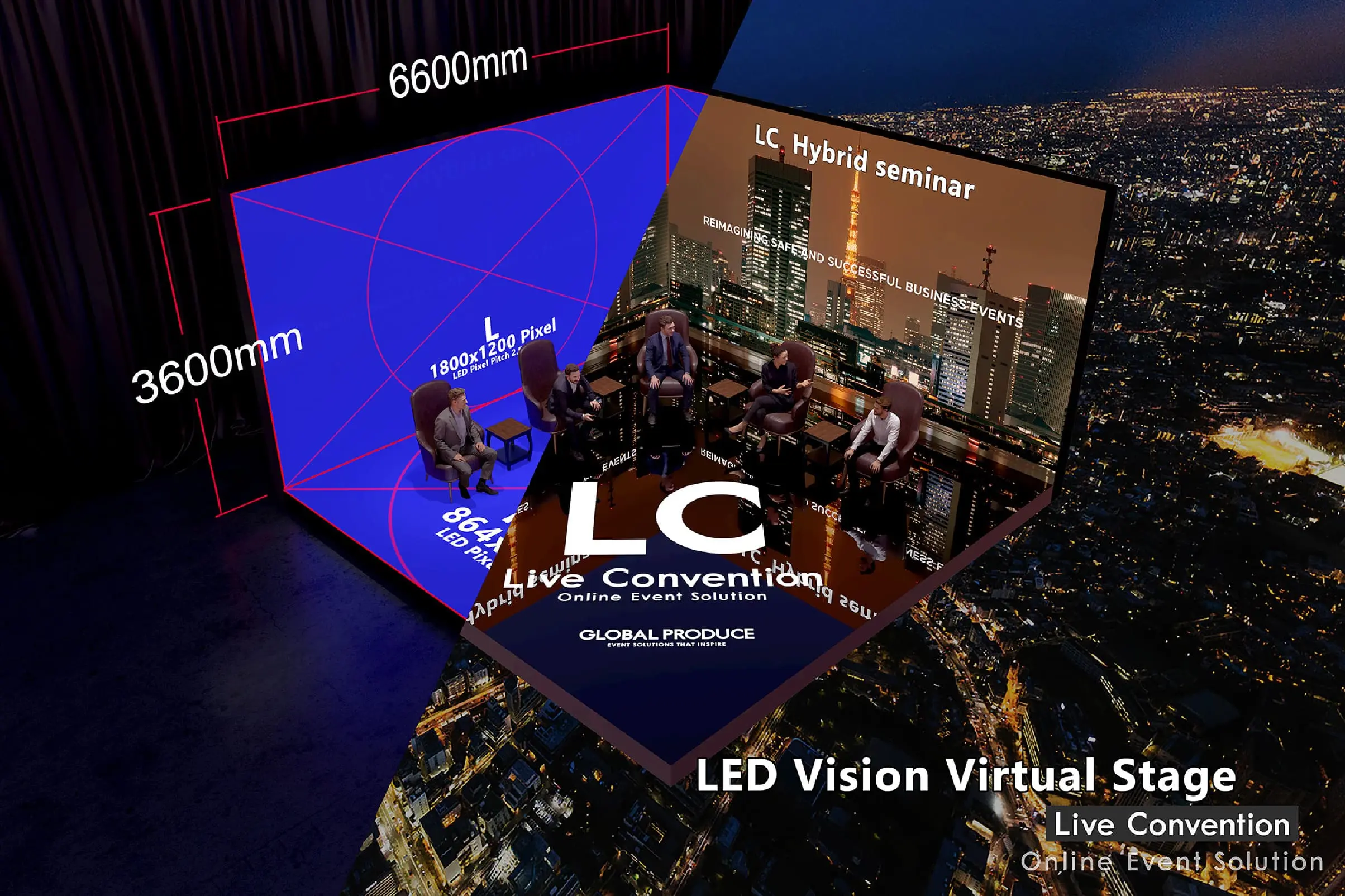 A setup featuring a 6600mm x 3600mm LED vision arranged in a V-shape, with additional LEDs on the floor to display the background. This allows for a more vivid and immersive experience than CG, as speakers can also see the background footage.