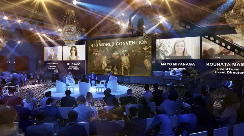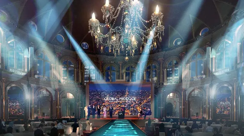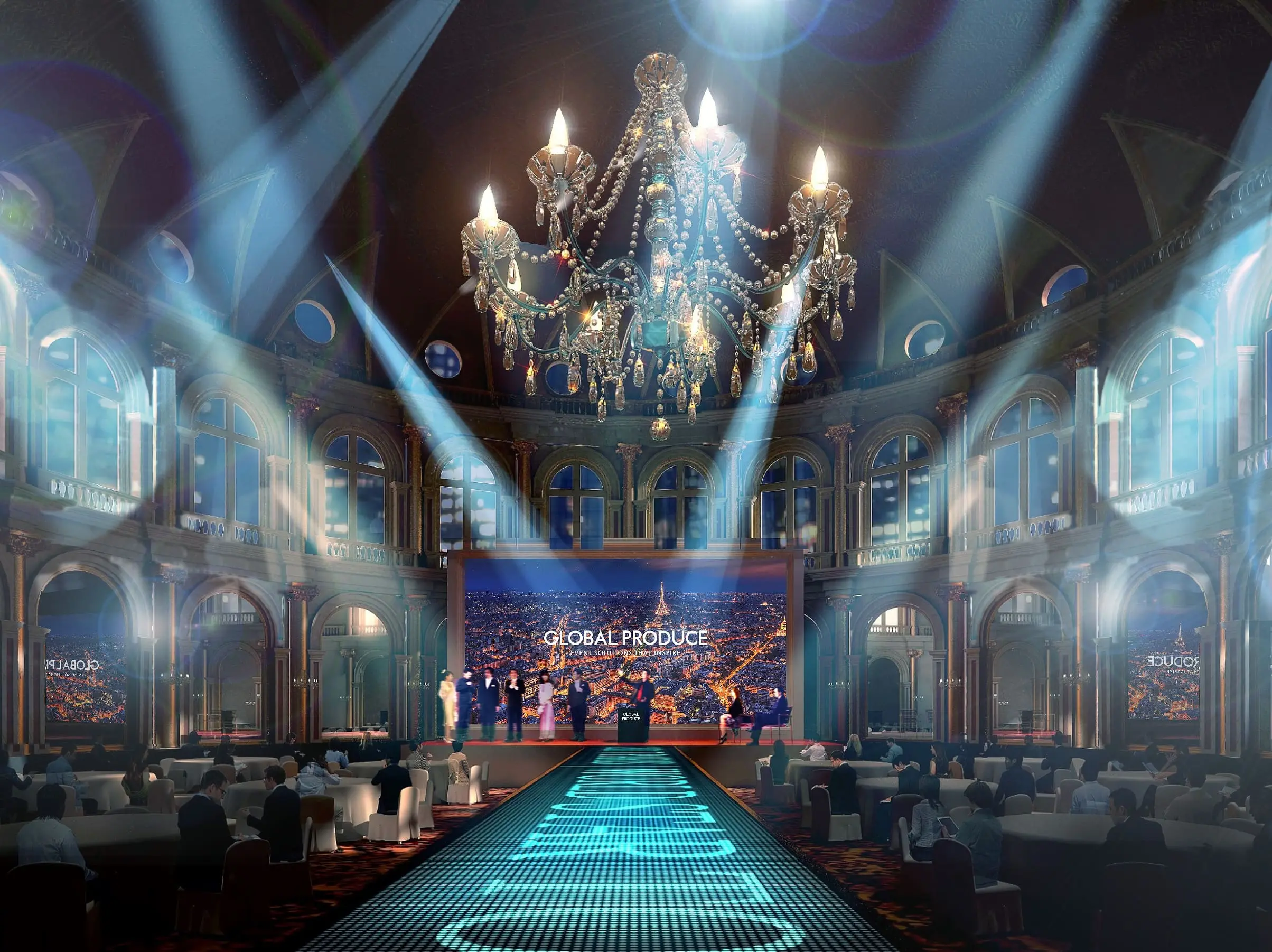 High ceilings and chandeliers create a luxurious conference space, while the seating arrangement surrounding the stage evokes a summit-like atmosphere. The glamorous ambiance, reminiscent of European high society, adds a special charm.