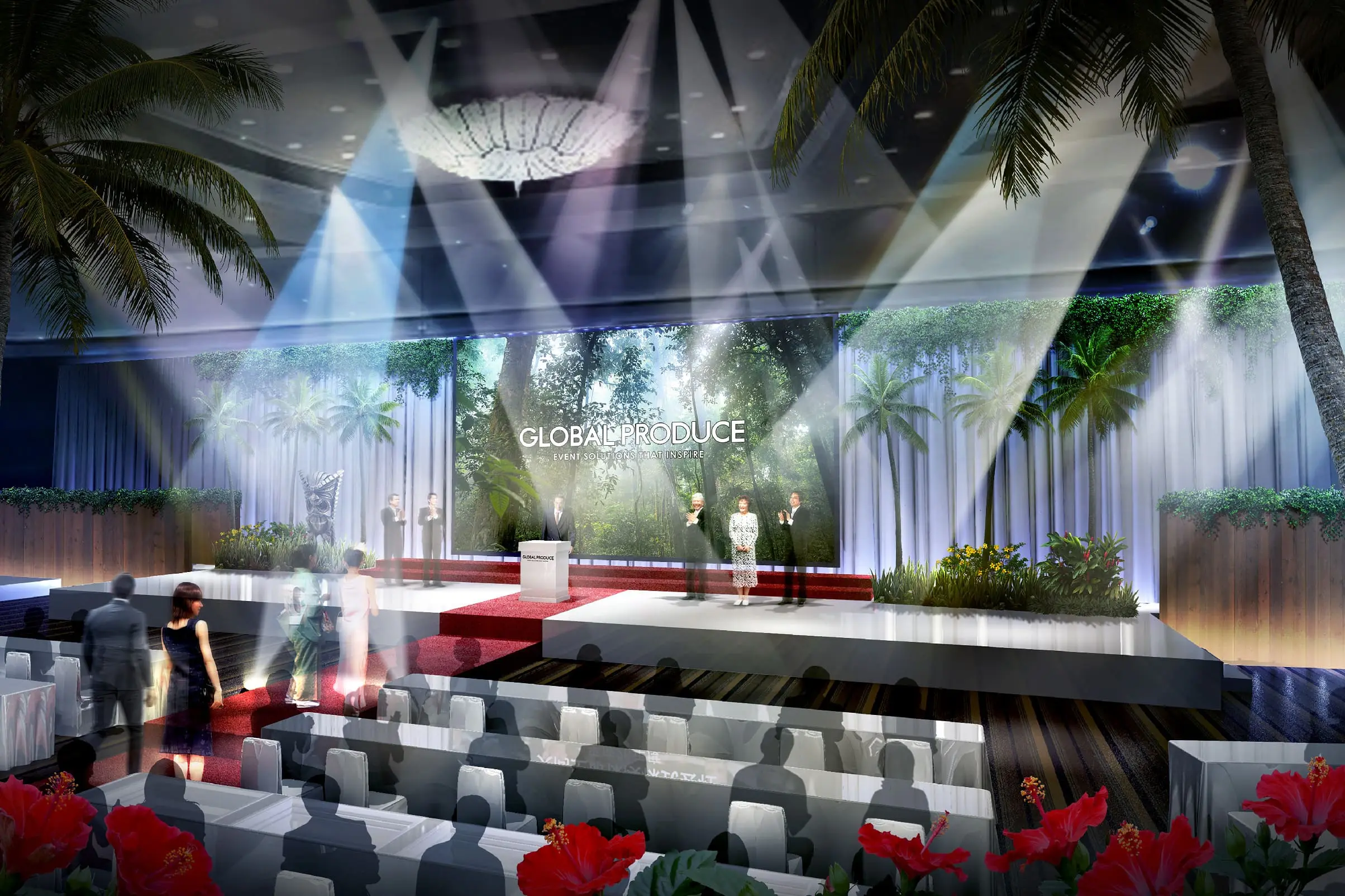 A spatial design for the Okinawa Convention Center. The production is structured with the solemnity of an international conference, ensuring maximum visibility for all attendees.
