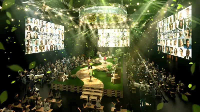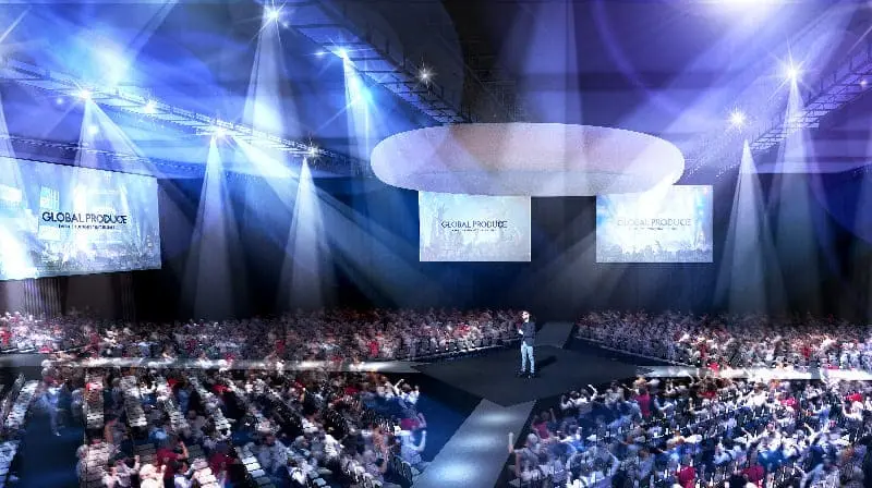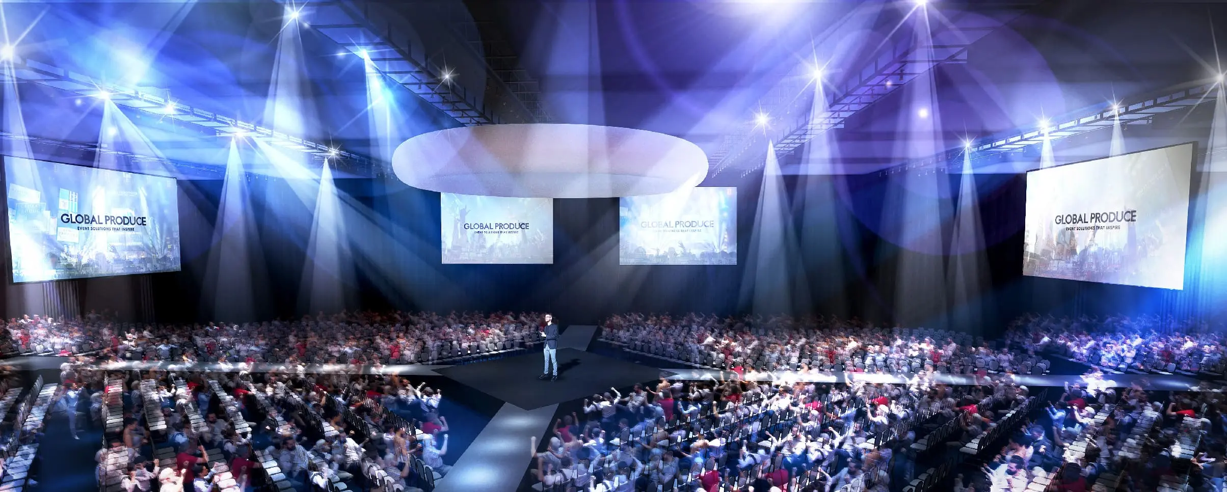 A conference featuring an extra-large, curved-corner screen, flanked by vertical live video feeds. Tiered seating on the sides maximizes the three-dimensional feel and live atmosphere.