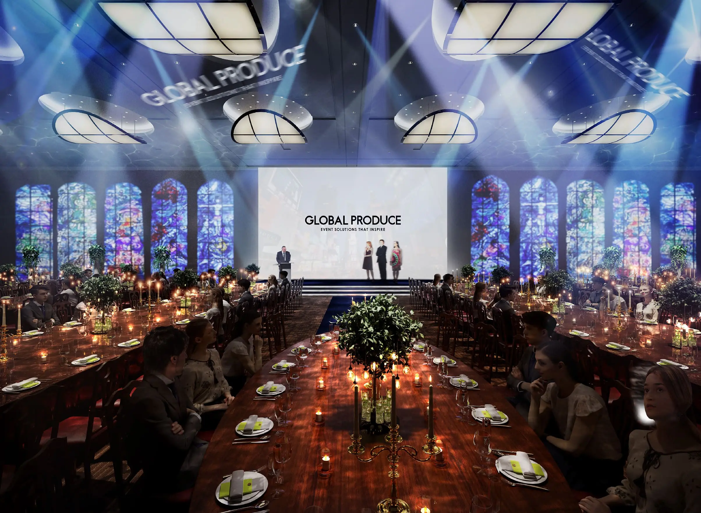 GALA PARTY spatial design (banquet style). Three 30,000-ANSI lumen projectors cast mappings onto arch-shaped side panels, creating a stained-glass-style world.