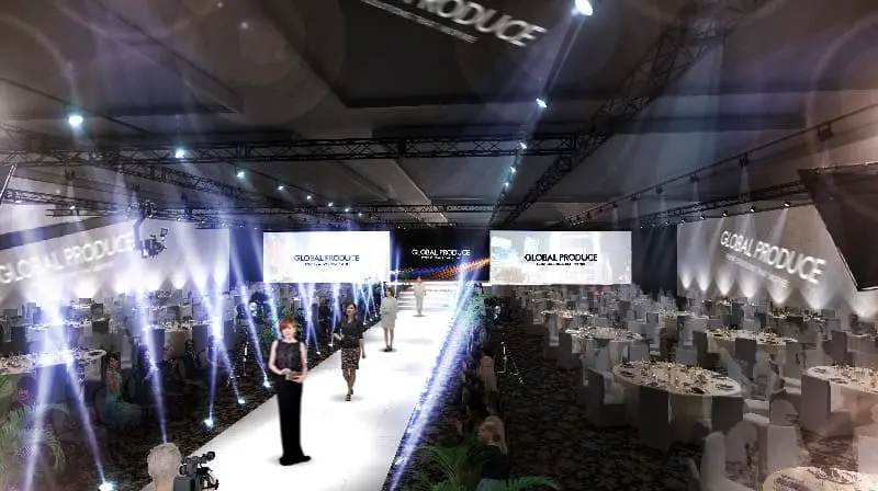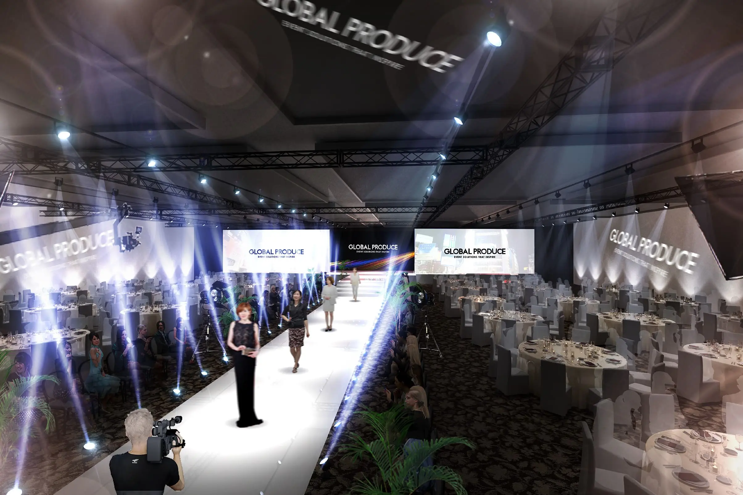 A cool and sophisticated space featuring a wide screen set within a historic building. This fashion-show-style awards event is woven together with spectacular lighting and stage decorations.