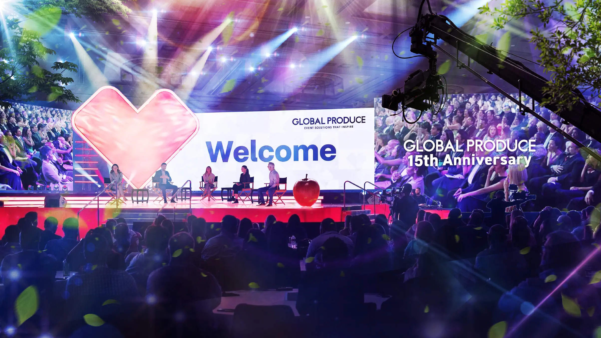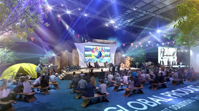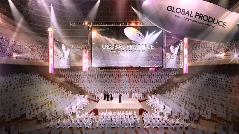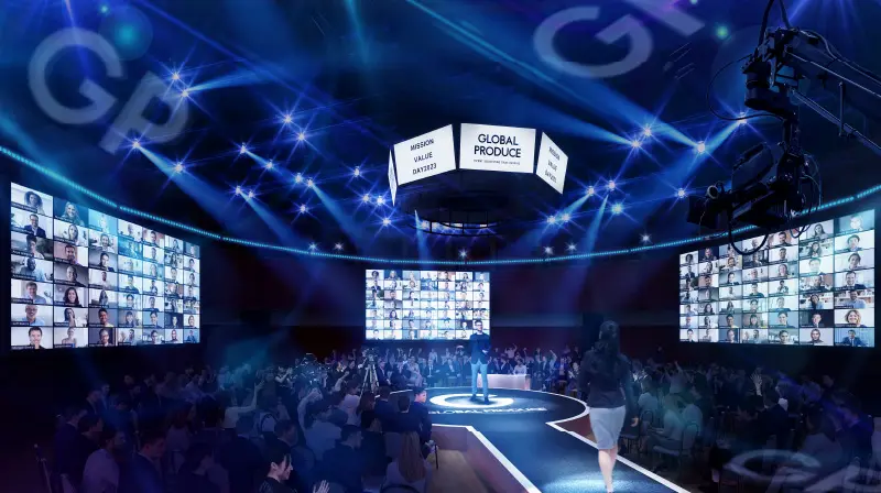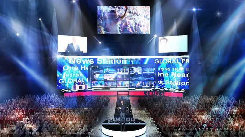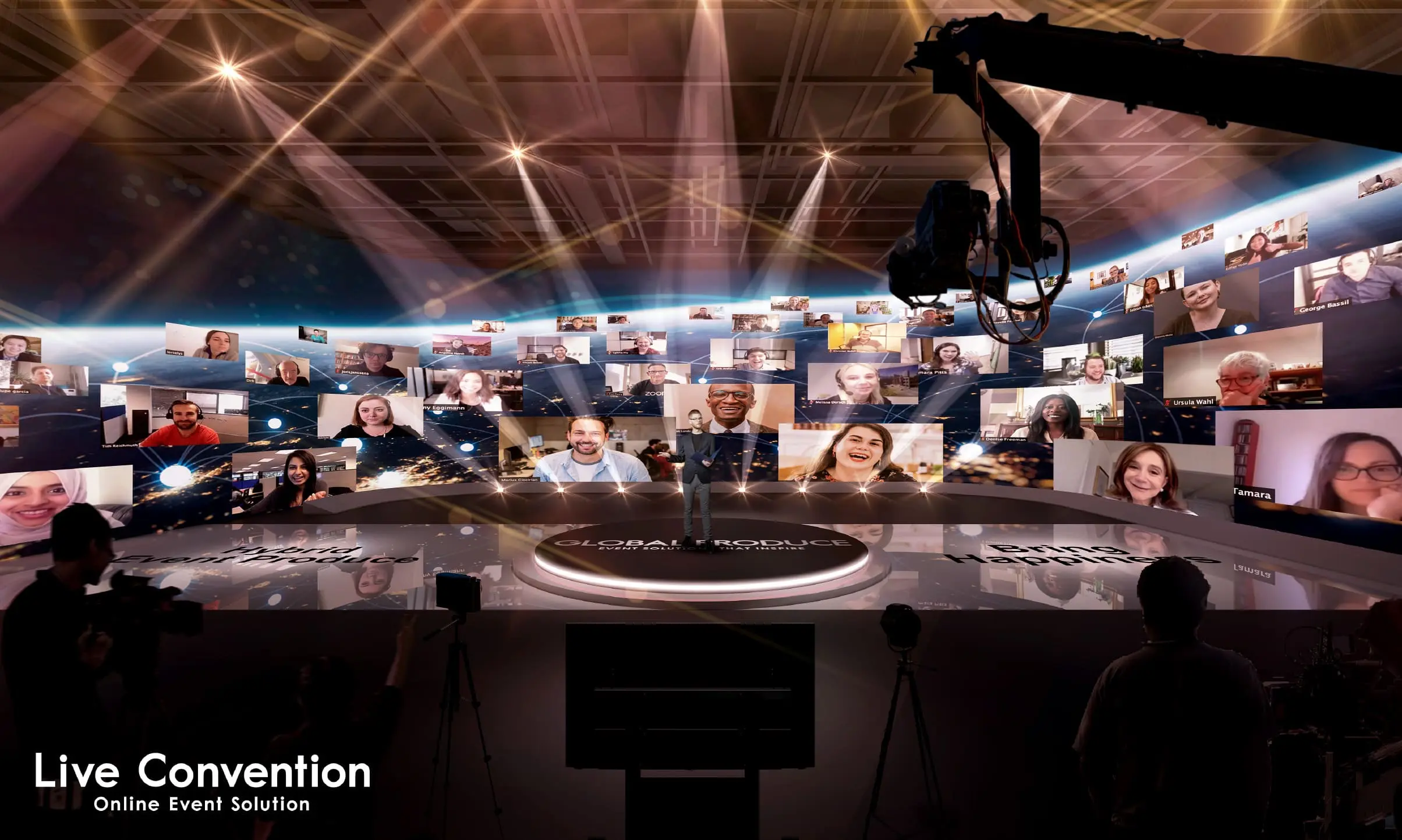 A global online event connecting the entire world. Behind the physical stage, a massive 7.5m high x 25m wide screen projects the faces of viewers from around the globe, expressing the unity of all participants on the central circular stage.
