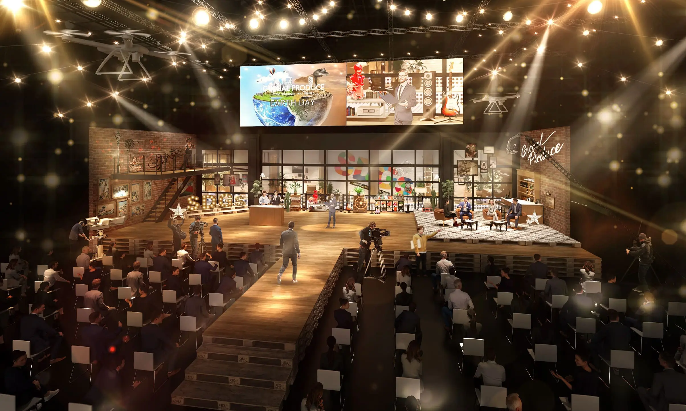 A company-wide meeting designed to look like a NEWS STUDIO. News-like presentation methods and camera work unify the entire space. The company's strategy is pre-recorded and edited in a documentary style.