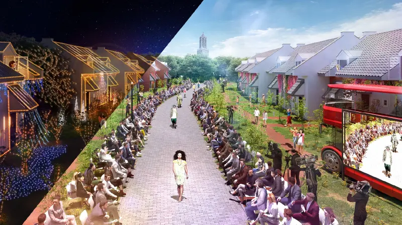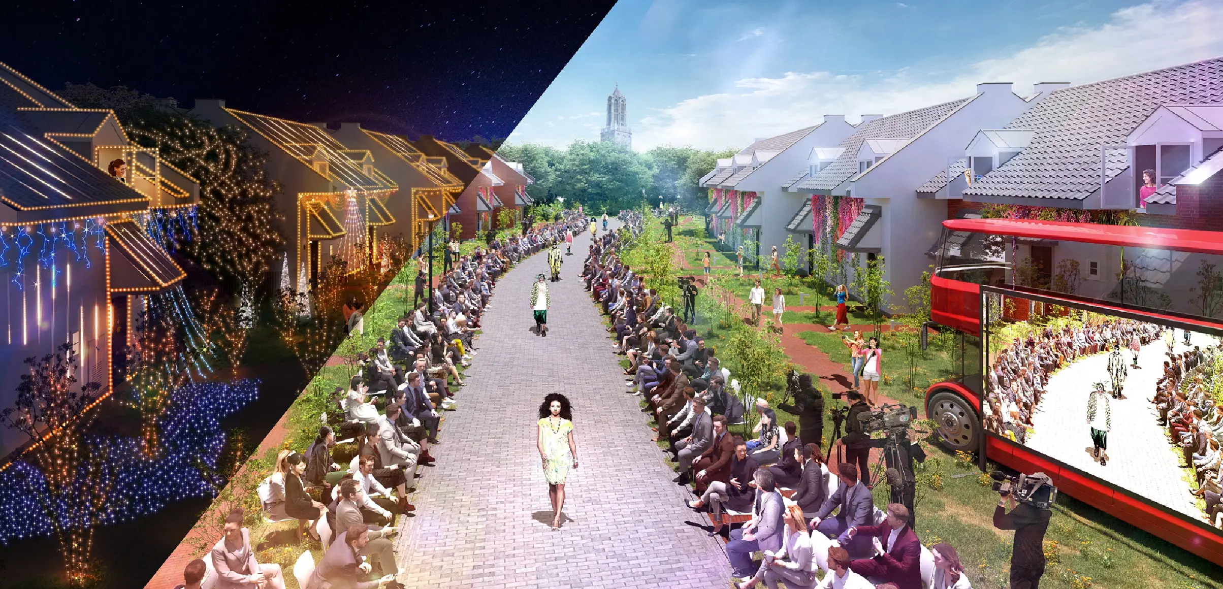 A sustainable center stage made of pallets, featuring a curved runway. This next-generation hybrid fashion show connects in-person and online attendees, with a design that ensures high visibility from every seat.