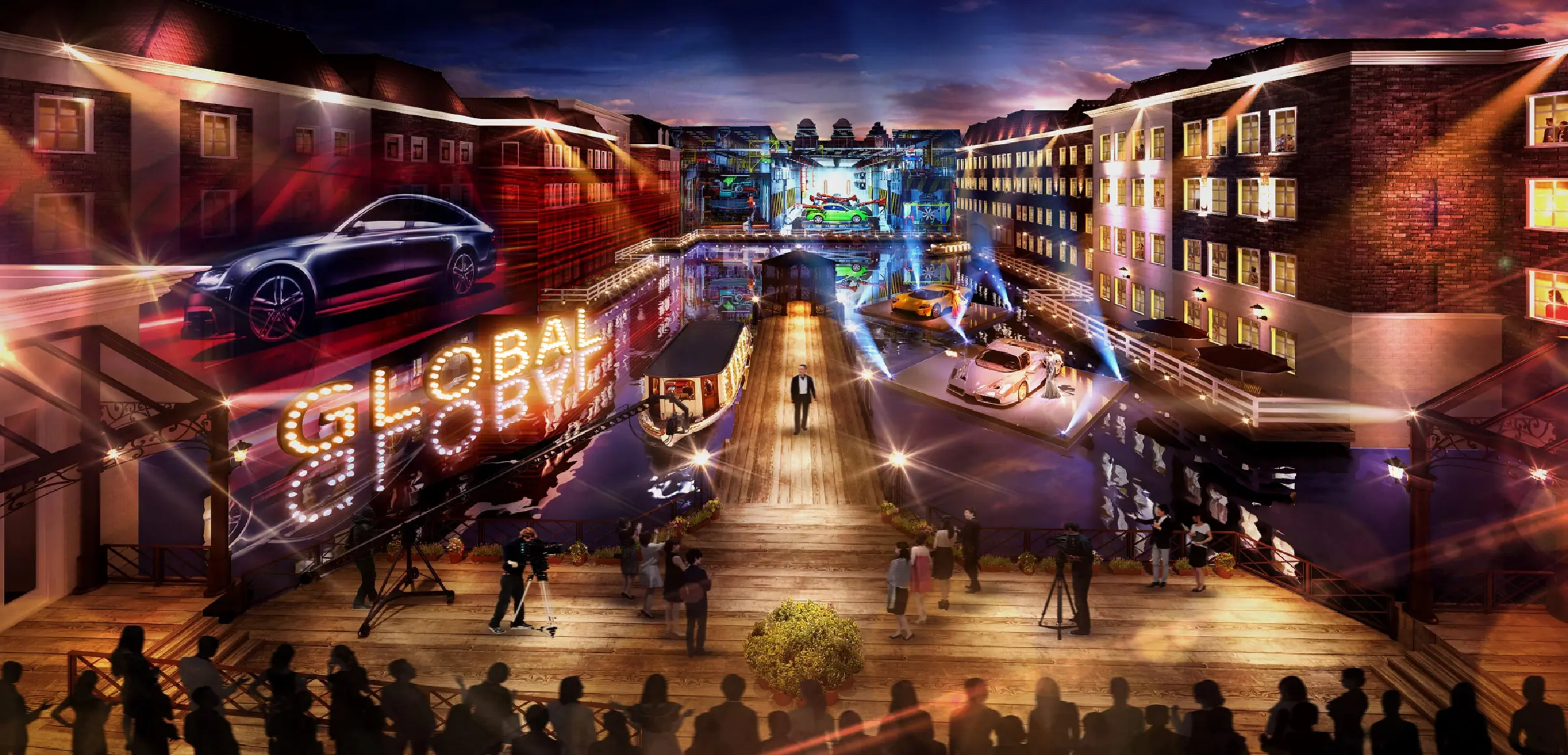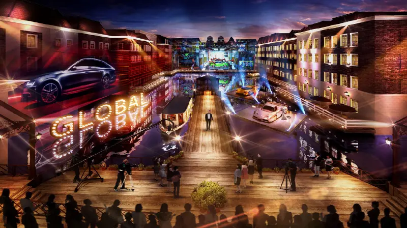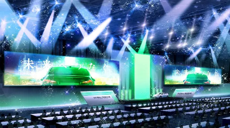 An innovative showcase featuring a car exhibit floating on water. The entrance of speakers from a boat adds a special impact. A U-shaped projection mapping immerses the audience in the presentation.