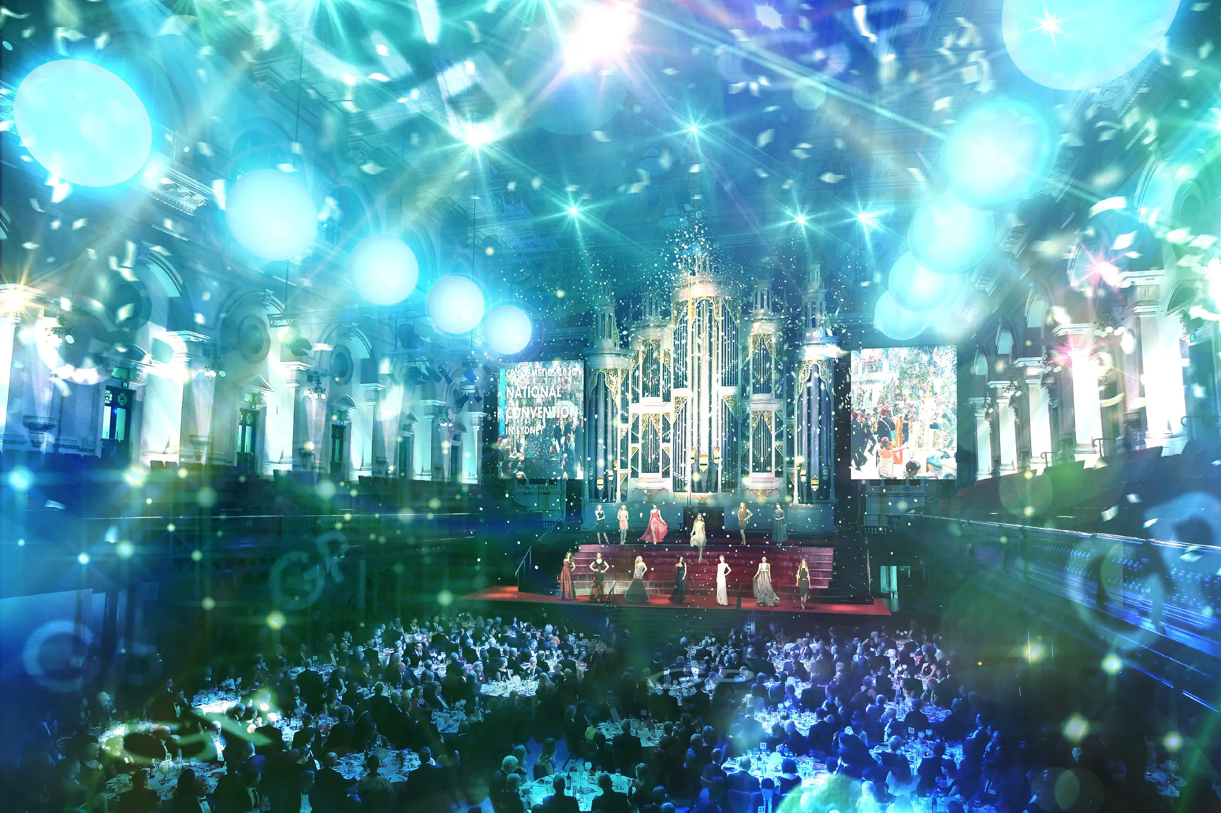 An awards ceremony at the Sydney Town Hall. The design makes maximal use of the venue's existing structures, such as the pipe organ and columns, while incorporating modern elements like LEDs and additional decorative lighting.