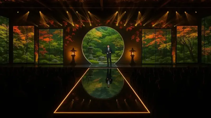 [AI] Through a circular window, a garden unfolds—reflected on the runway like still water. LEDs, lanterns, and autumn hues weave together to express Japan’s calm strength and timeless rhythm.