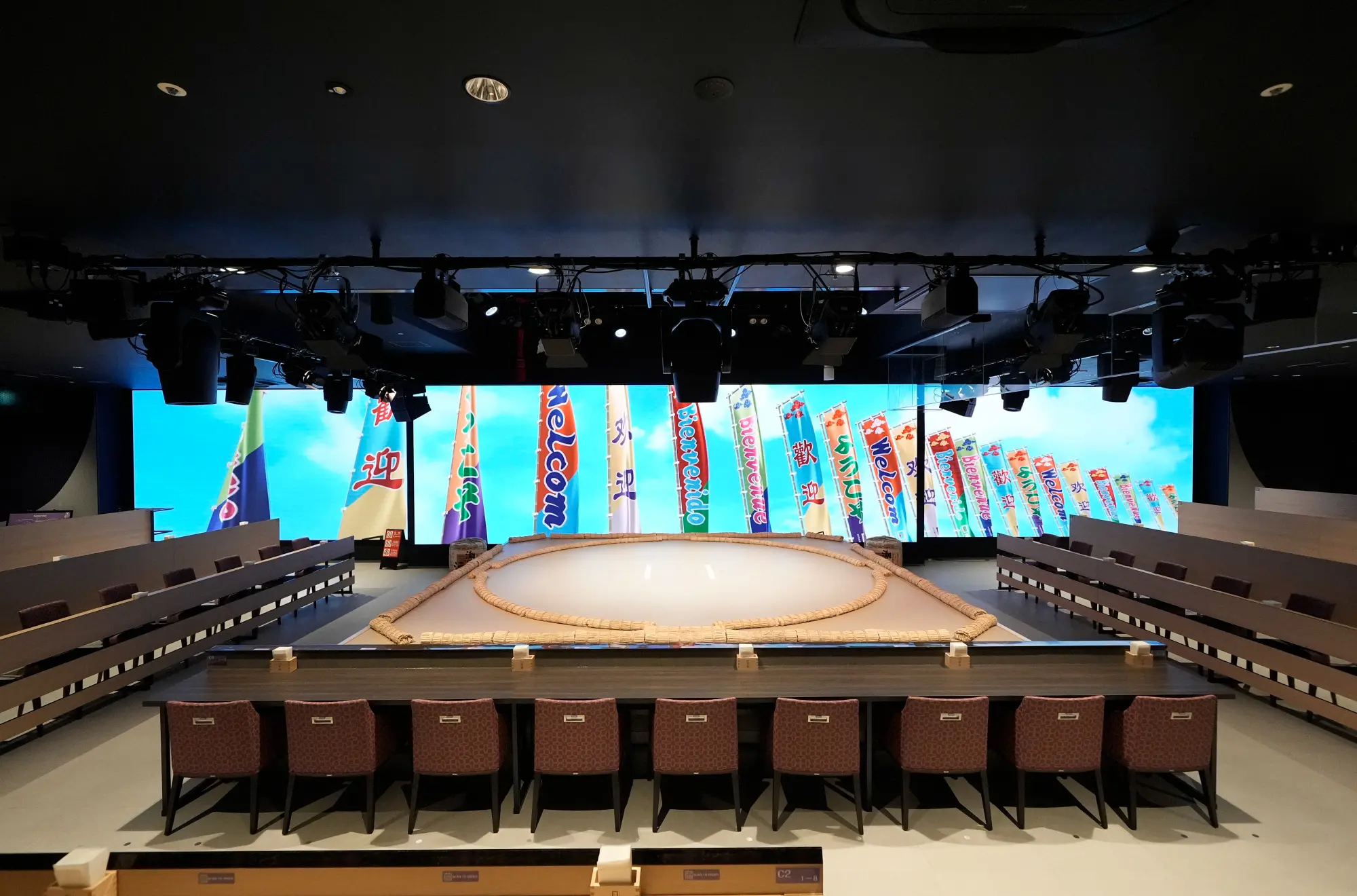 Located in Ginza, the extravagant heart of Japan, this space can accommodate up to approximately 150 guests and allows them to gather around a life-sized dohyō stage. Equipped with full video, audio, and lighting systems, it enables an immersive, one-of-a-kind production that can only be experienced here. A sake bar is also available within the venue.