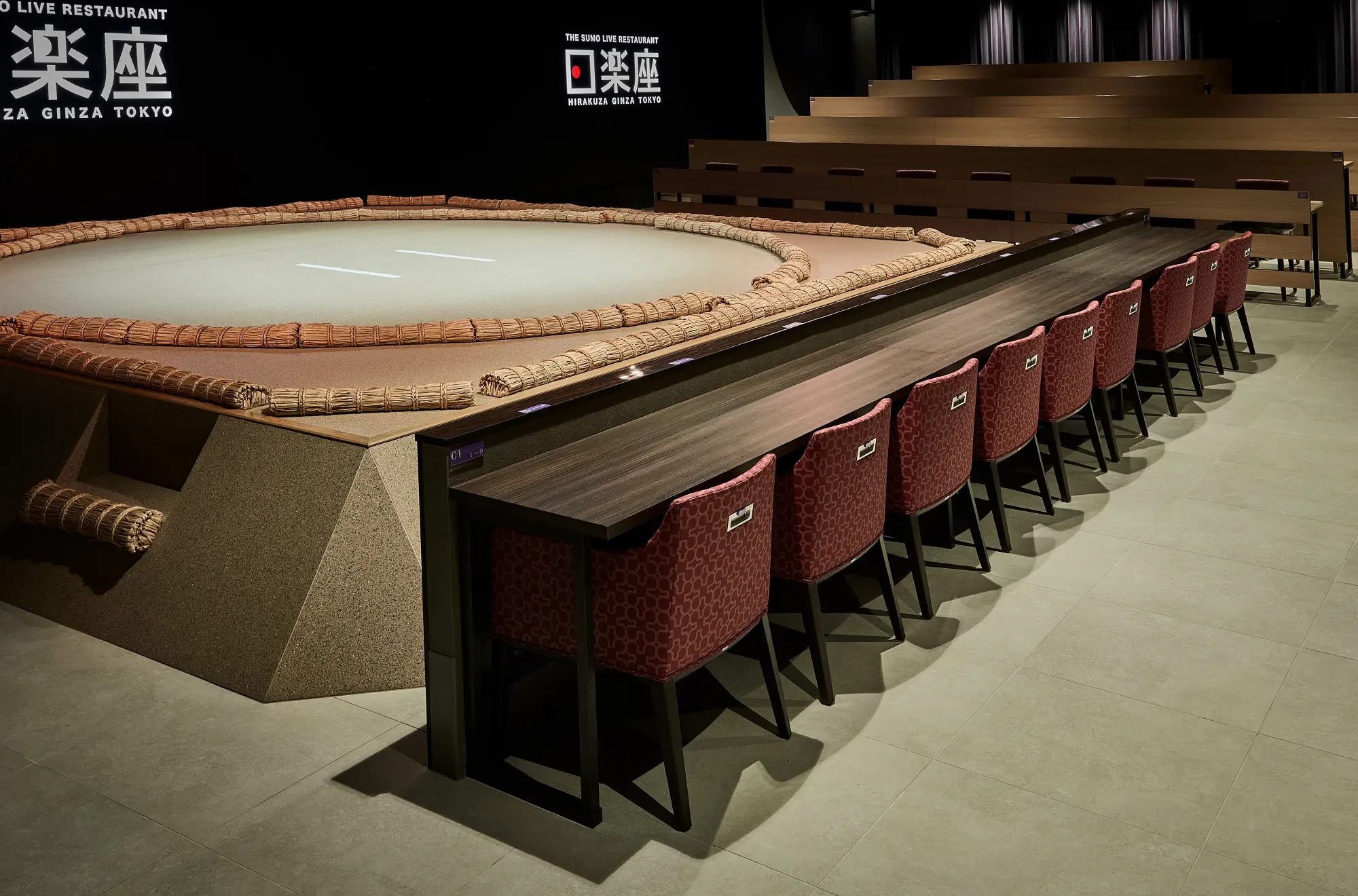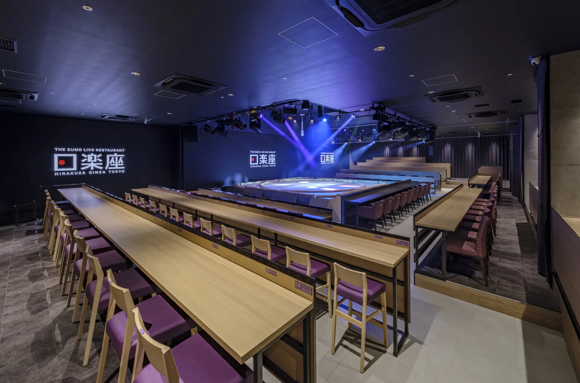 “THE SUMO LIVE RESTAURANT HIRAKUZA GINZA TOKYO” features a life-sized dohyō stage at its center, adopting a theater-style layout where approximately 150 seats surround the stage in a 270-degree arrangement. Equipped with three large video screens, concert-specific speakers, and professional lighting systems, the venue creates an incredible sense of immersion. This uniquely Japanese space, where sumo and culinary experiences can merge, is ideal for receptions hosting international guests, corporate events, and other occasions where a sense of exclusivity and a special atmosphere is desired.