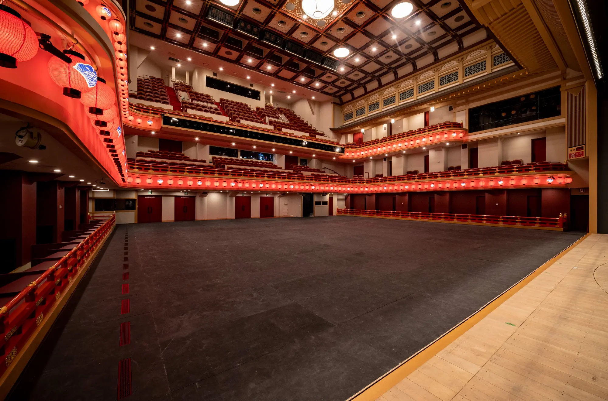 This three-story venue contains approximately 1,000 seats, allowing guests to fully enjoy the distinctive architecture and décor of a kabuki theater, such as the first-floor sajiki box seats (raised box seating), the hanamichi, and the red paper lanterns. Additionally, the first-floor seating can be removed to create a completely flat space, making it suitable for standing events as well.